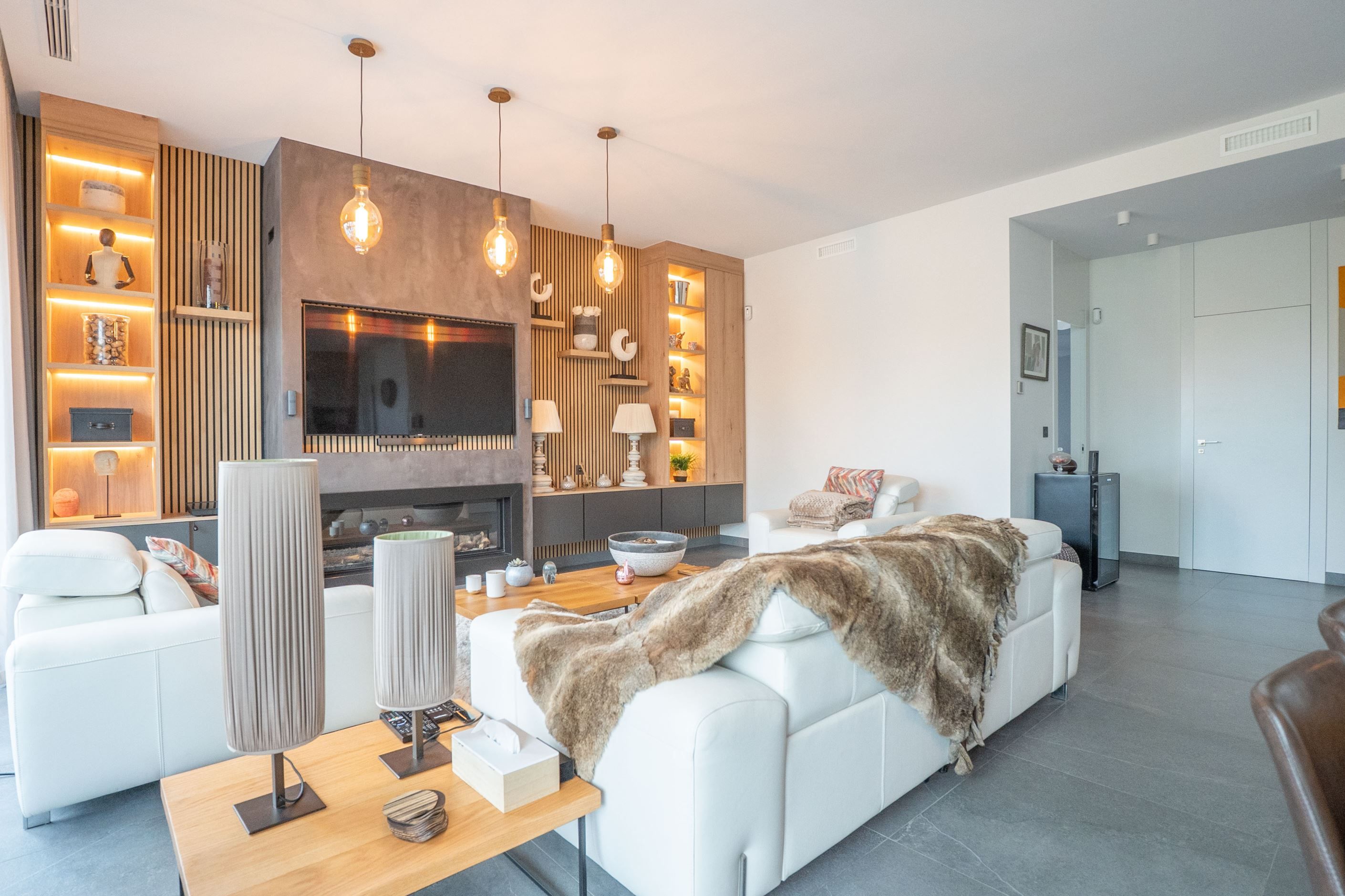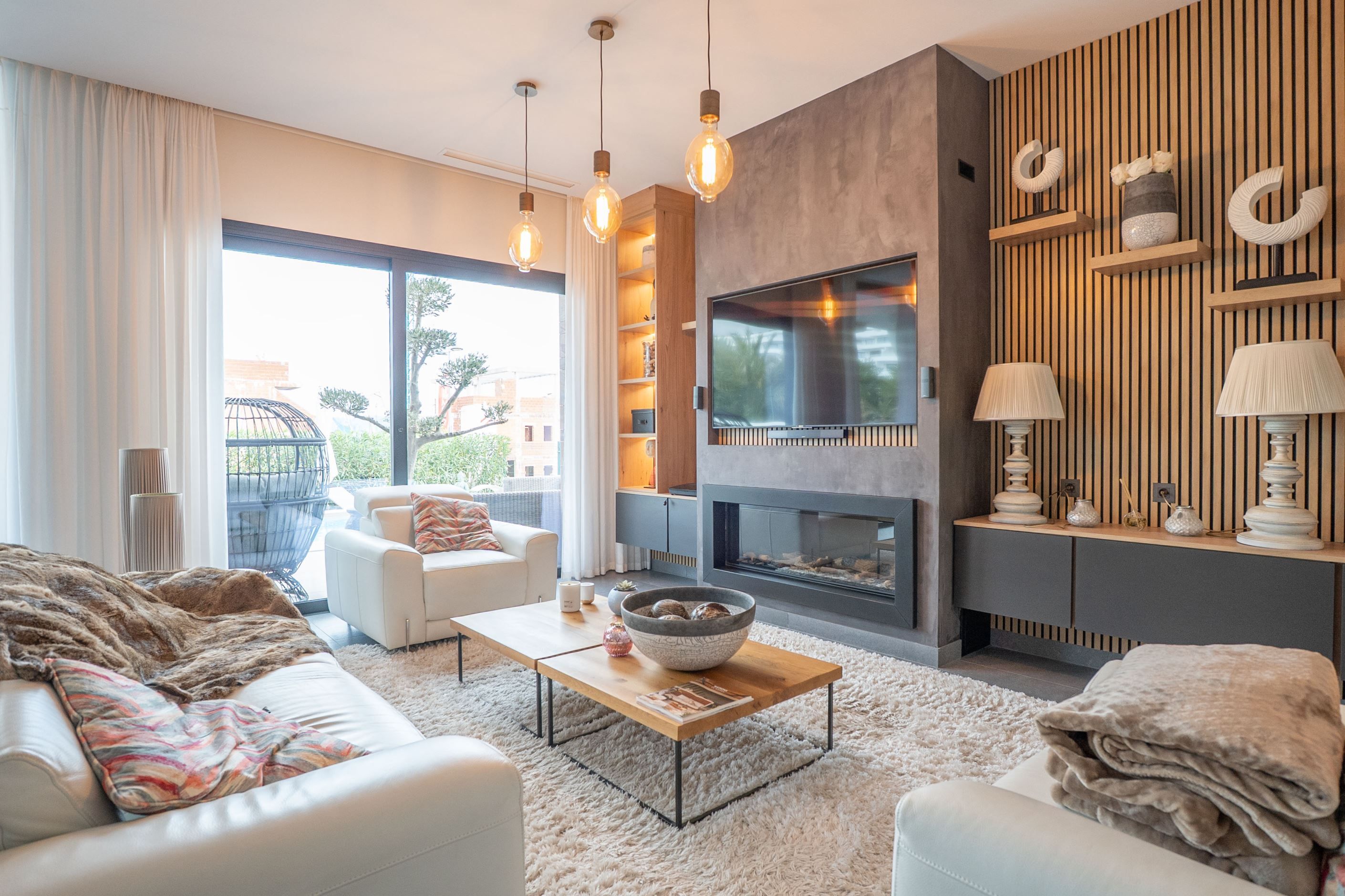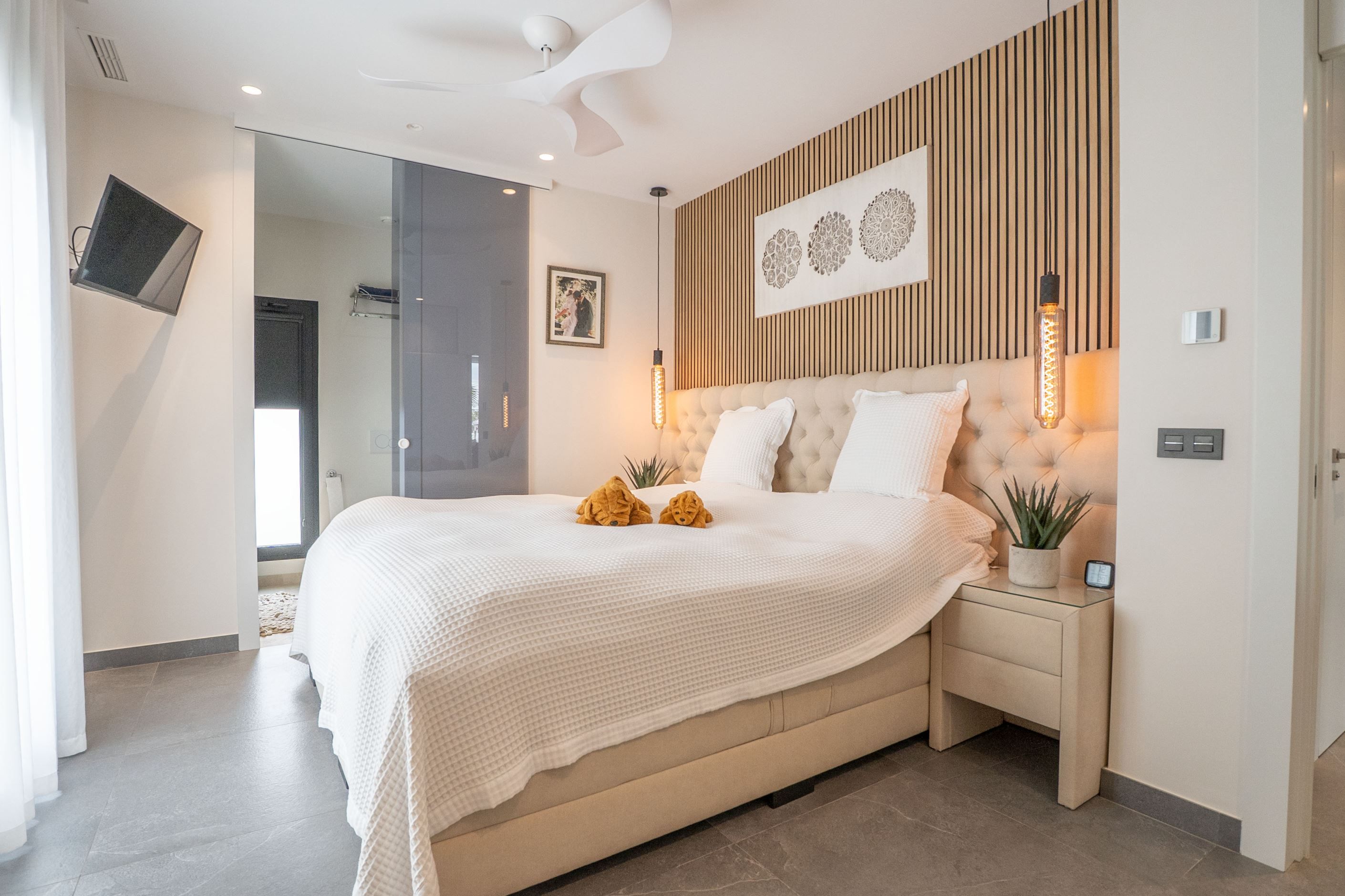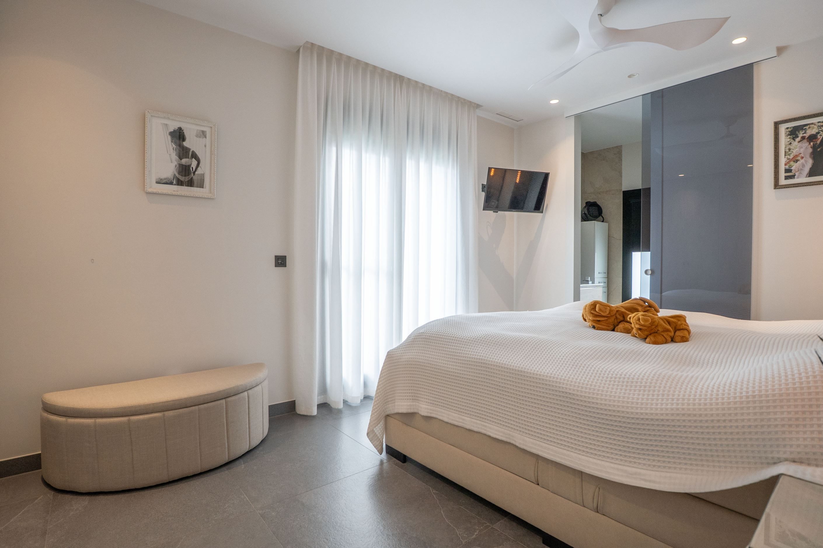 Villan har en funktionell och genomtänkt planlösning med öppna sällskapsytor som integrerar vardagsrum, matplats och ett fullt utrustat modernt kök. Den erbjuder rymliga sovrum med inbyggda garderober samt moderna badrum, utformade för både permanent boende och semesterbruk. Stora fönsterpartier och direkt tillgång till terrasser skapar en naturlig koppling mellan inne- och utemiljö.
