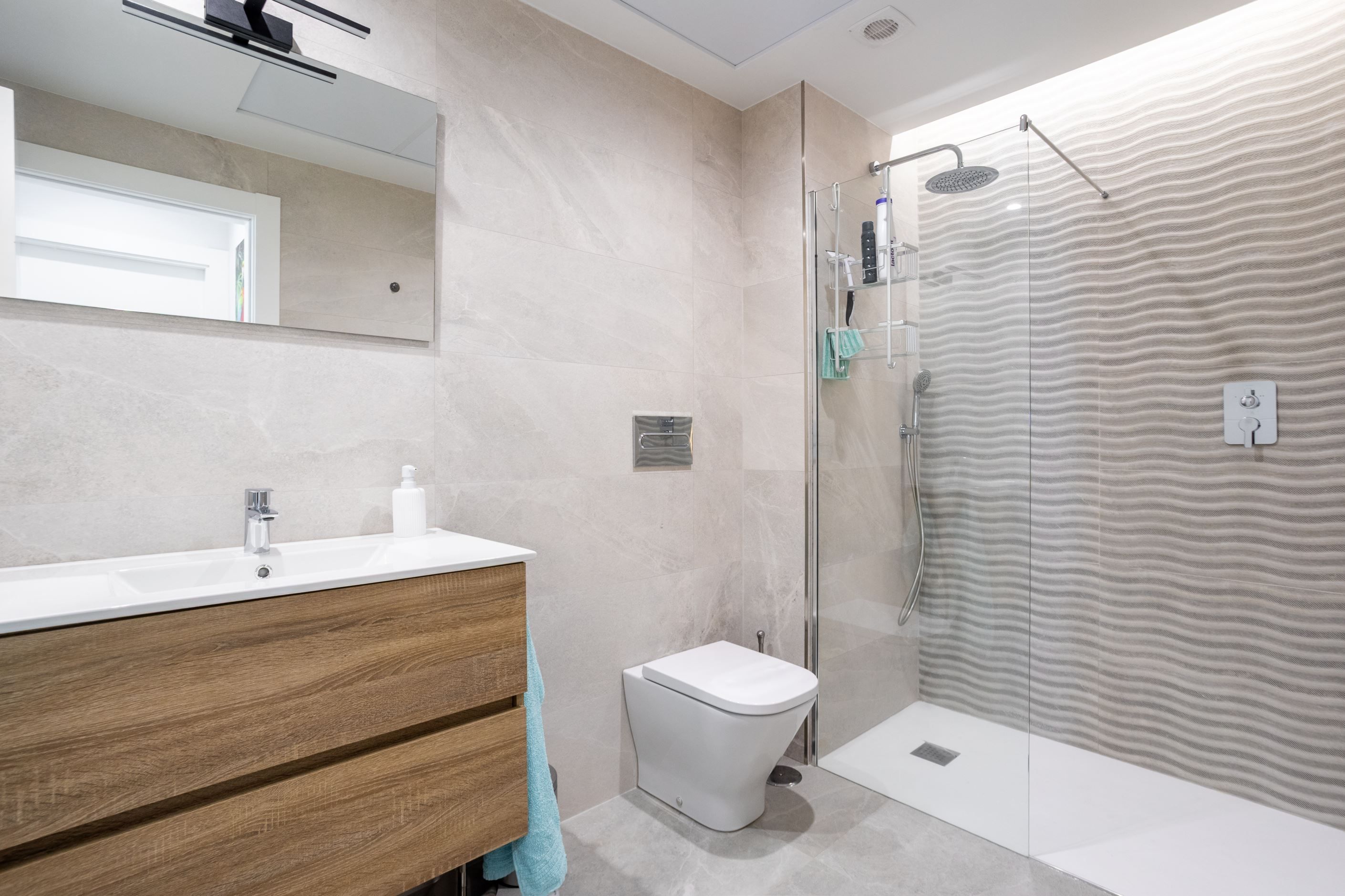 Badrummet är stilrent och utrustat med toalett, handfat med kommod och dusch med glasvägg. Det finns även ett fönster för ljusinsläpp och ventilation.