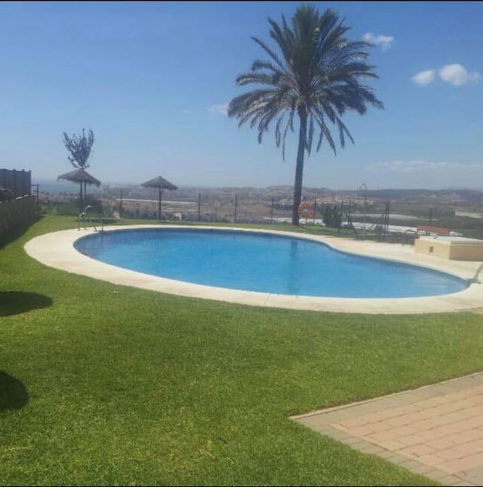 En inflyttningsklar bostad med balkong och garage med utsikt över hav, pool och Baviera golf.
