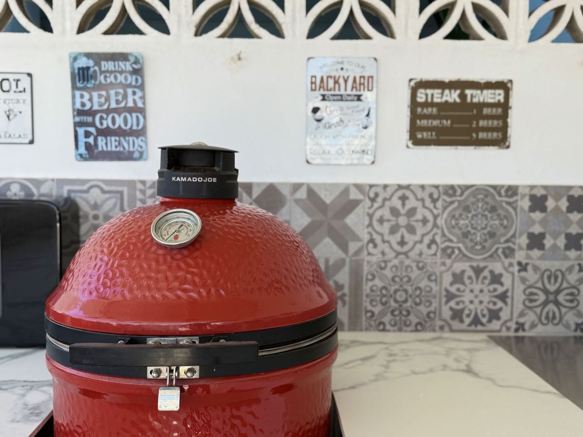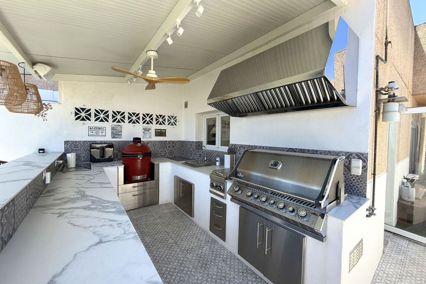 Den 98 m² stora terrassen ligger på samma nivå som lägenheten och fungerar som en förlängning av vardagsrummet under bar himmel. Här finns ett fullt utrustat utekök med grill, diskho och kyl, matplats för sex personer, barsektion, utomhusdusch och till och med en privat gymyta. En del av terrassen är inglasad och används idag som kontor med AC – men kan enkelt fungera som ett extra gästrum.