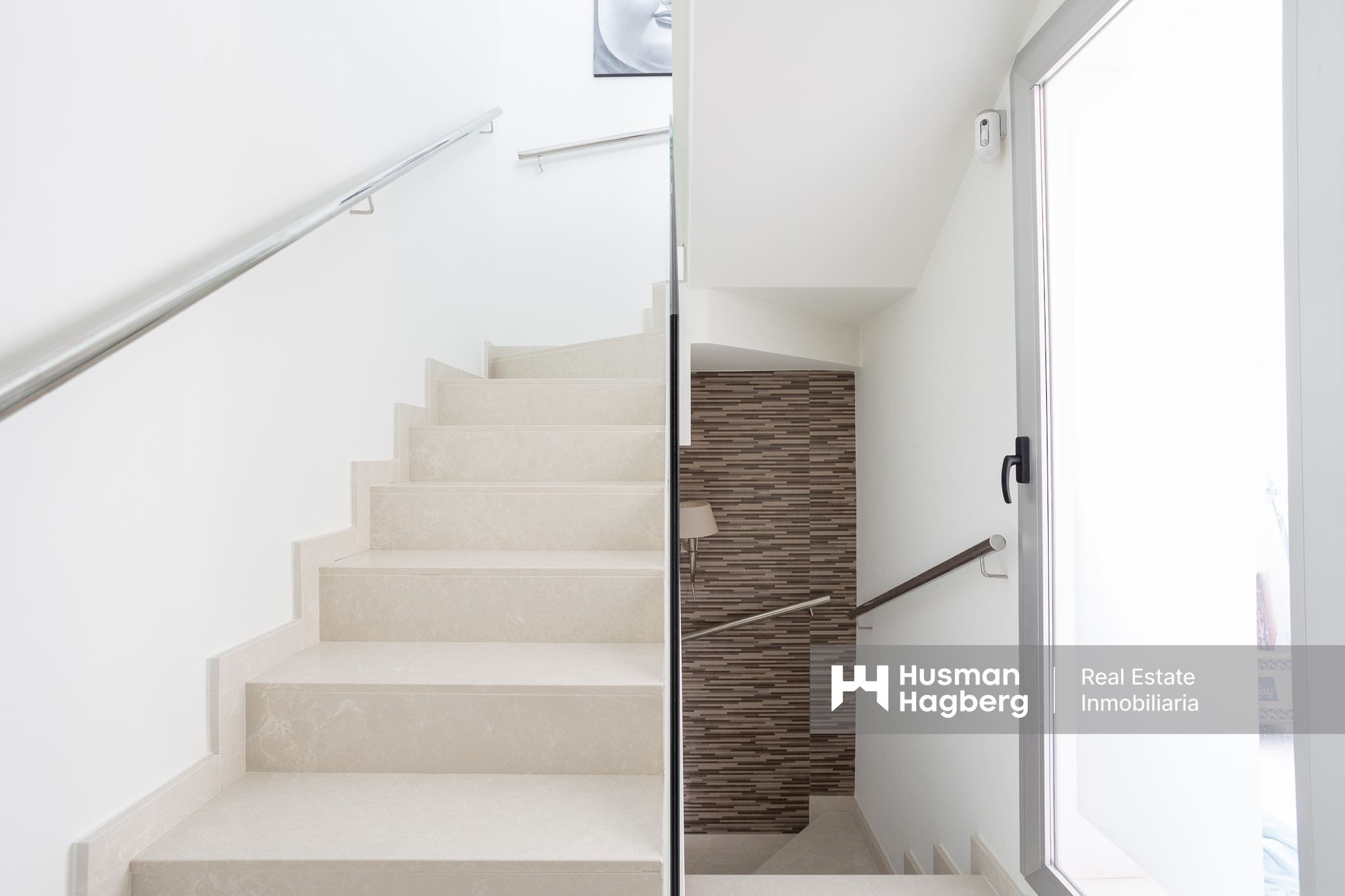Högst upp i huset finns ett glasat taksolarium med panoramautsikt – en plats att njuta av lugna morgnar med kaffe eller magiska kvällar i solnedgången. Det finns gott om förvaringsutrymmen både inne och ute, vilket gör hemmet lika praktiskt som vackert.