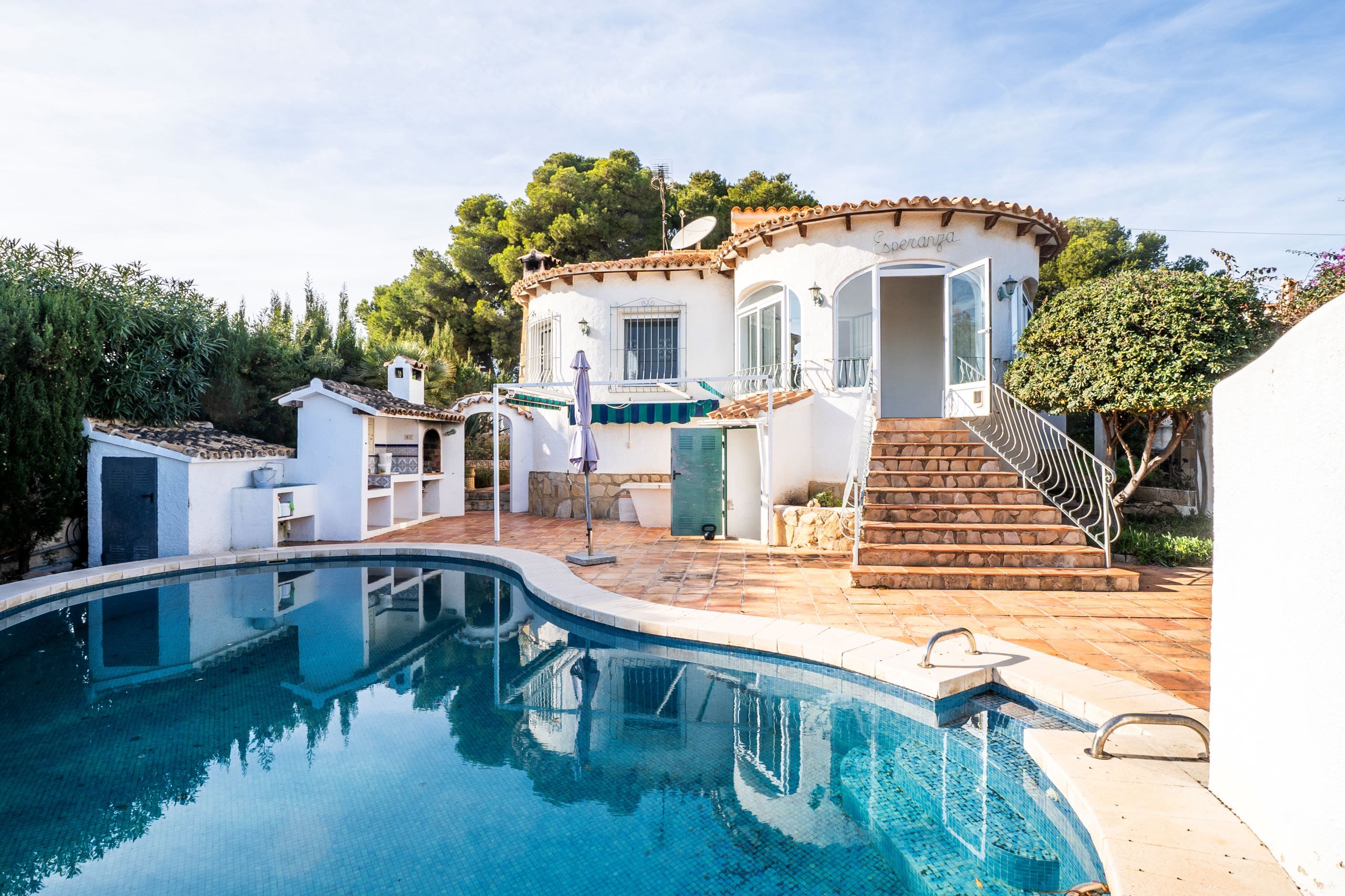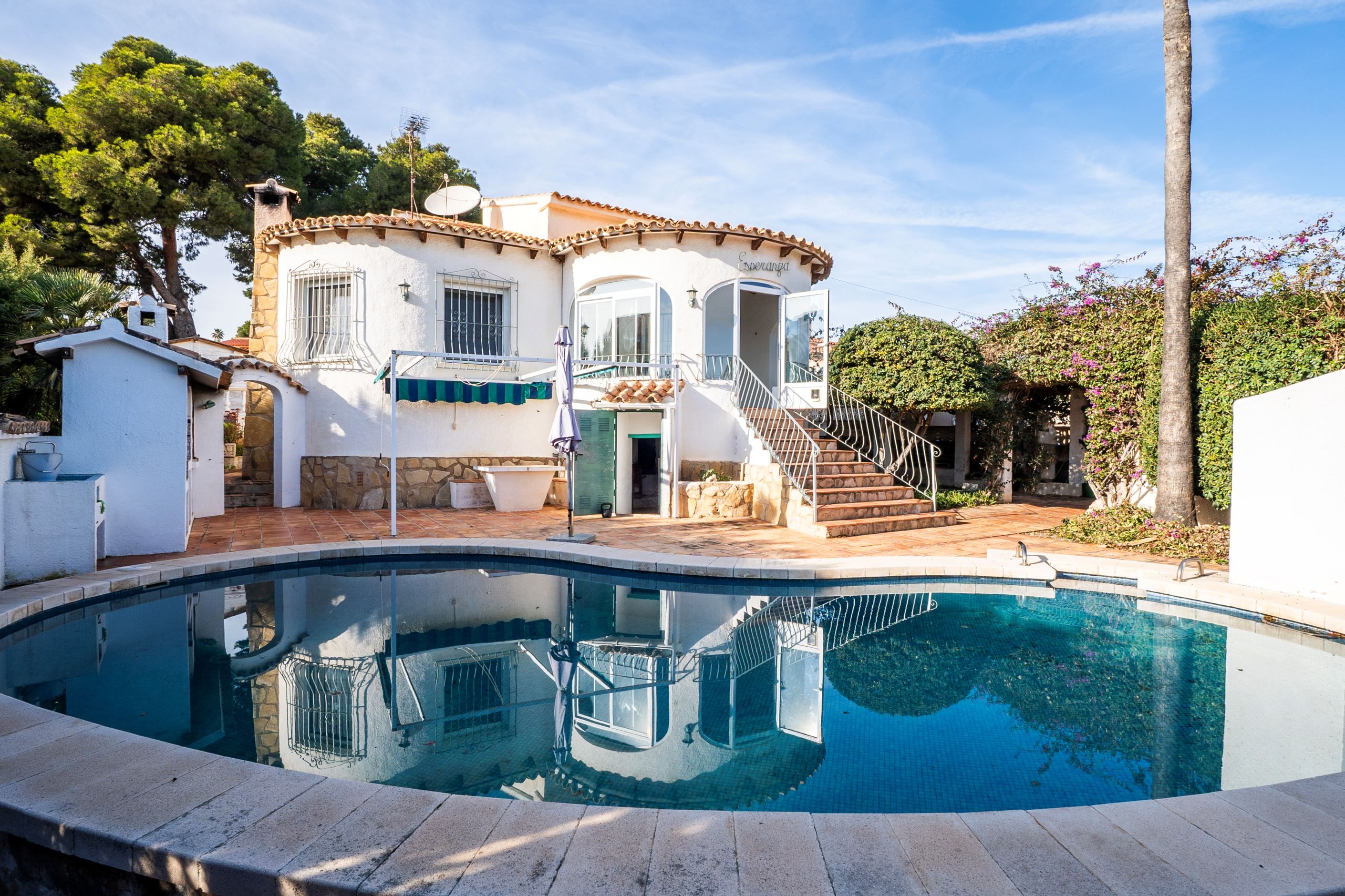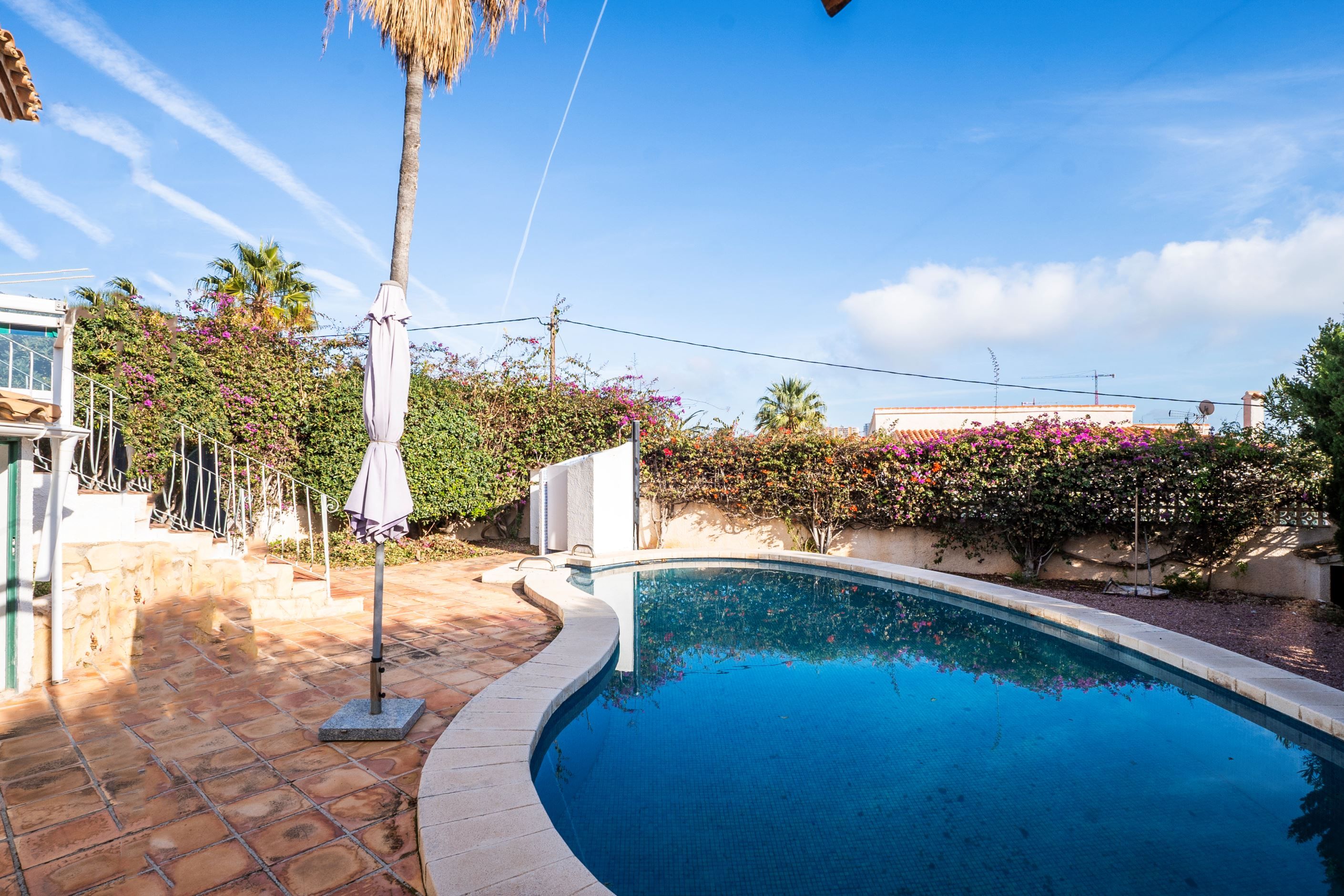Vi presenterar denna villa belägen i ett lugnt och välbeläget område i Calpe, på en rymlig och plan tomt som erbjuder både avskildhet, komfort och vacker utsikt över Peñón de Ifach.