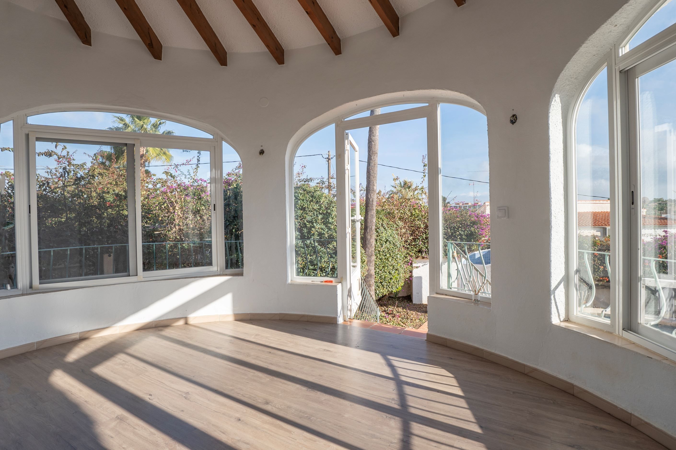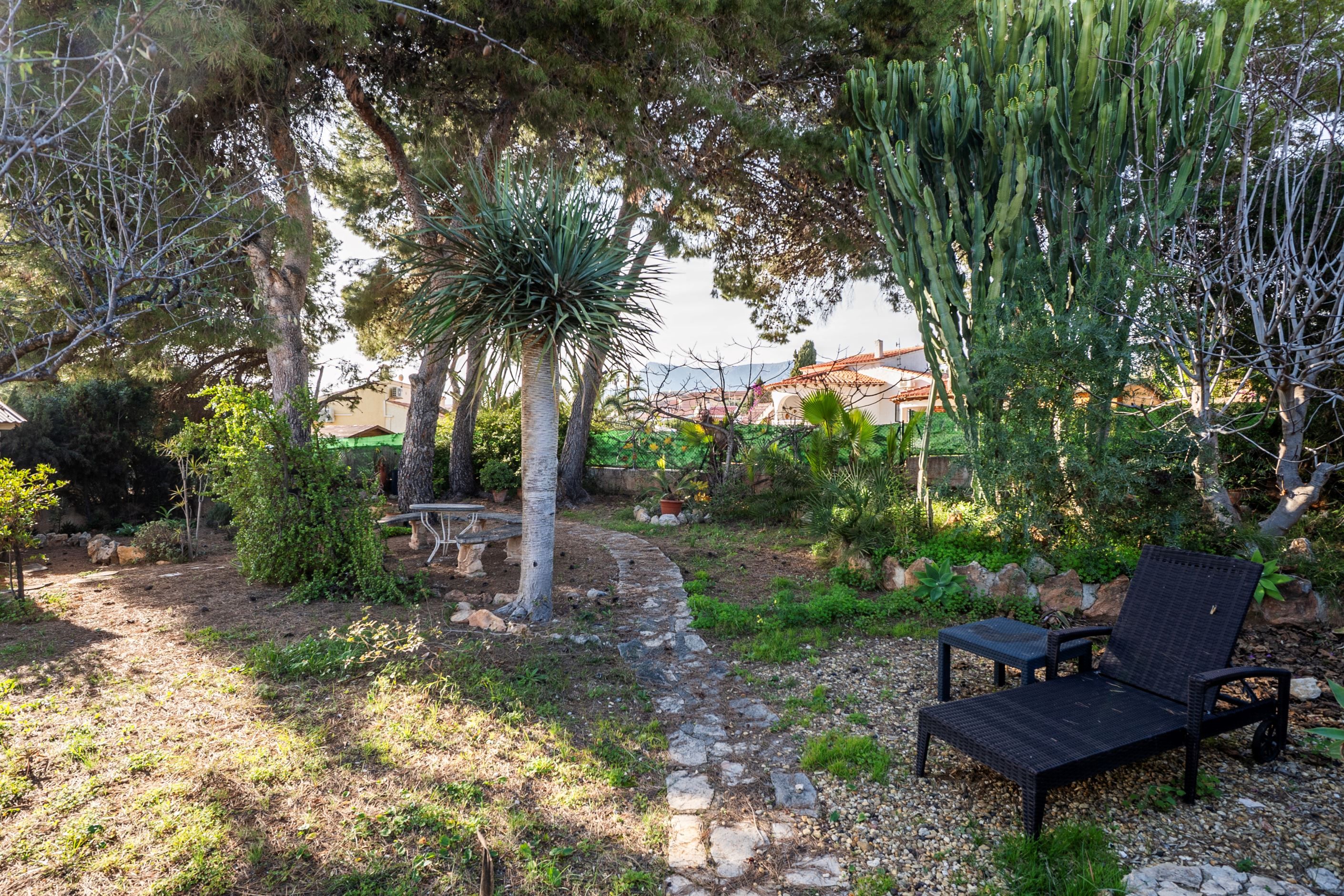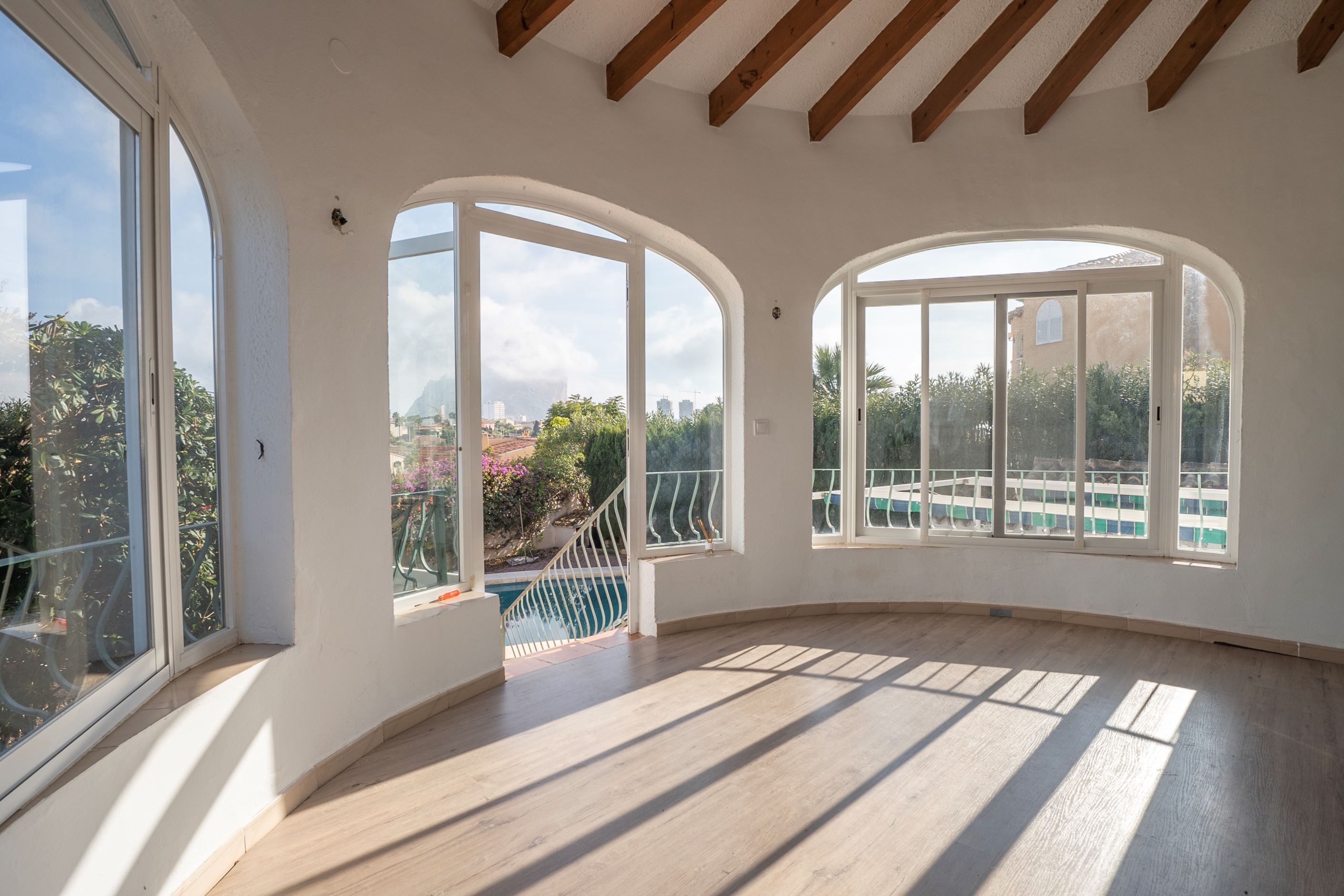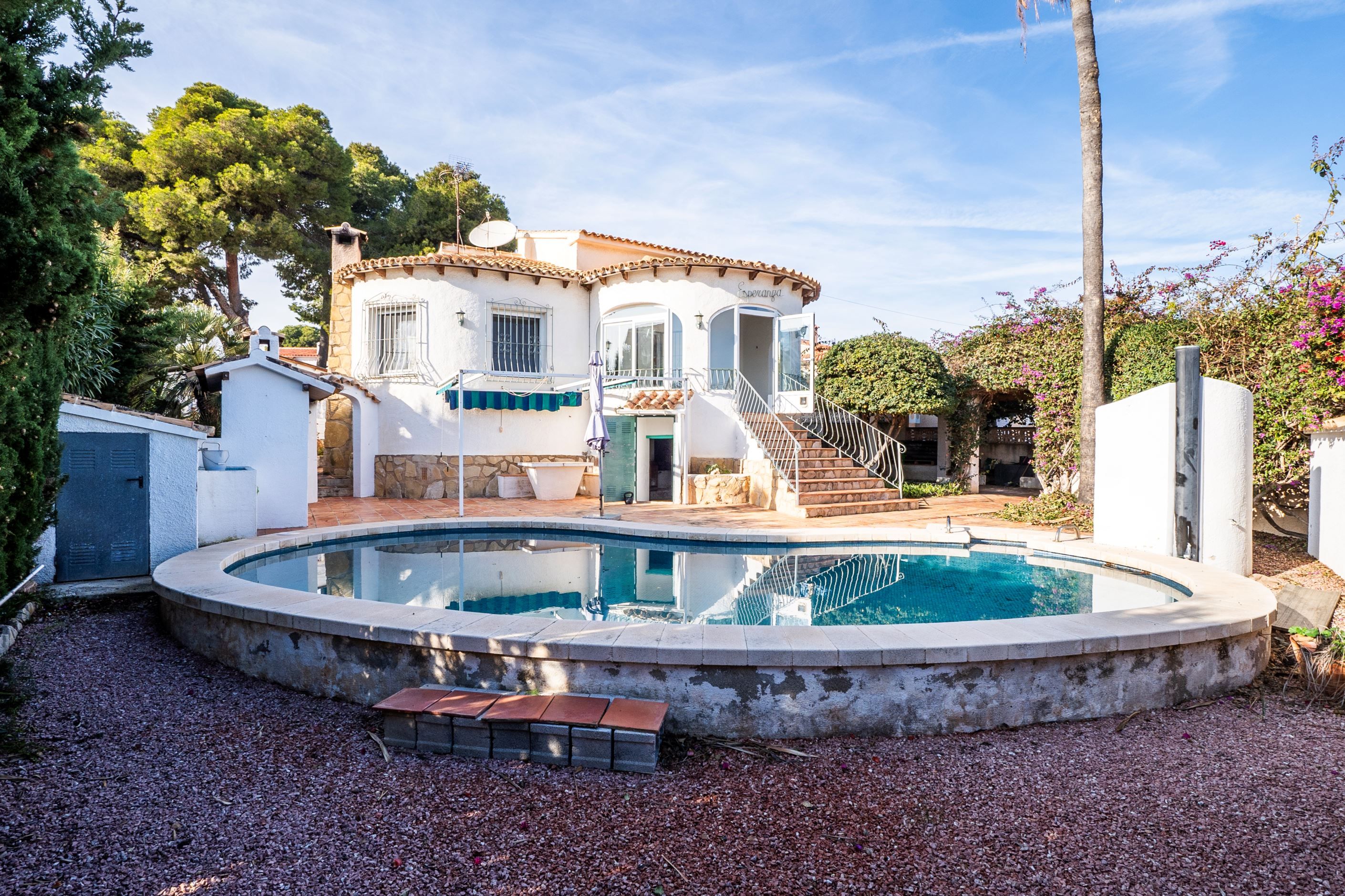 Vi presenterar denna villa belägen i ett lugnt och välbeläget område i Calpe, på en rymlig och plan tomt som erbjuder både avskildhet, komfort och vacker utsikt över Peñón de Ifach.