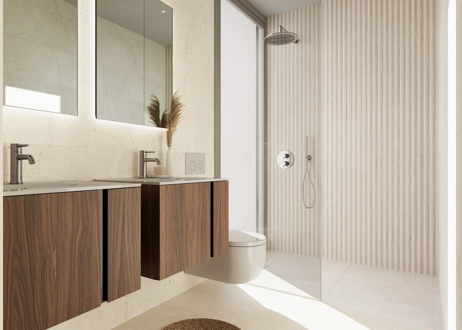 Interiören är elegant och genomtänkt, med inbyggda garderober i sovrummen och fullt utrustade badrum. Köken levereras möblerade och försedda med moderna vitvaror, och Porcelanosa-ytor i både kök och badrum adderar en exklusiv känsla till helheten. Motoriserade persienner, termiskt brytande fönsterpartier och förinstallation för luftkonditionering bidrar till komfort året runt.