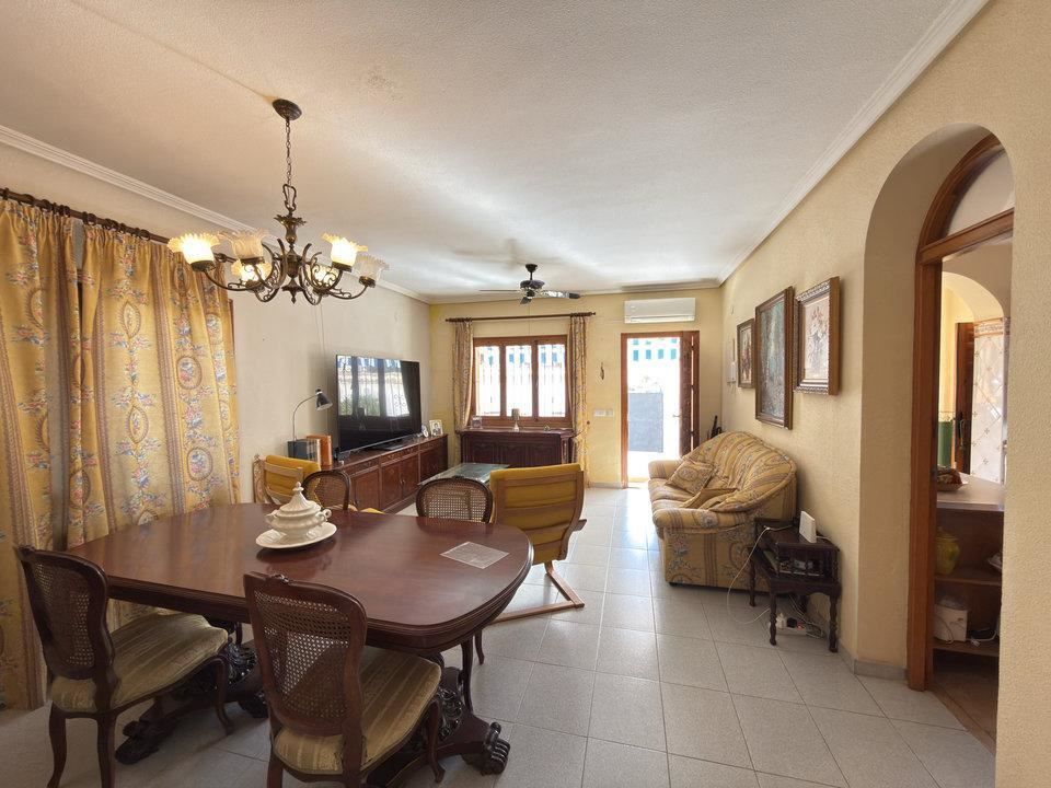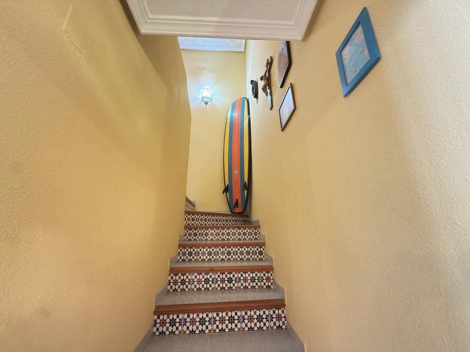 Vardagsrummet har en varm och inbjudande atmosfär, perfekt för lugna kvällar eller stunder med familj och vänner, medan köket ligger i anslutning och erbjuder både praktiska arbetsytor och en naturlig plats för matlagning och samvaro. Från bostadens olika delar nås flera uteplatser - en terrass på markplan för morgonkaffet och en balkong en trappa upp där du kan njuta av utsikten och den friska medelhavsbrisen.