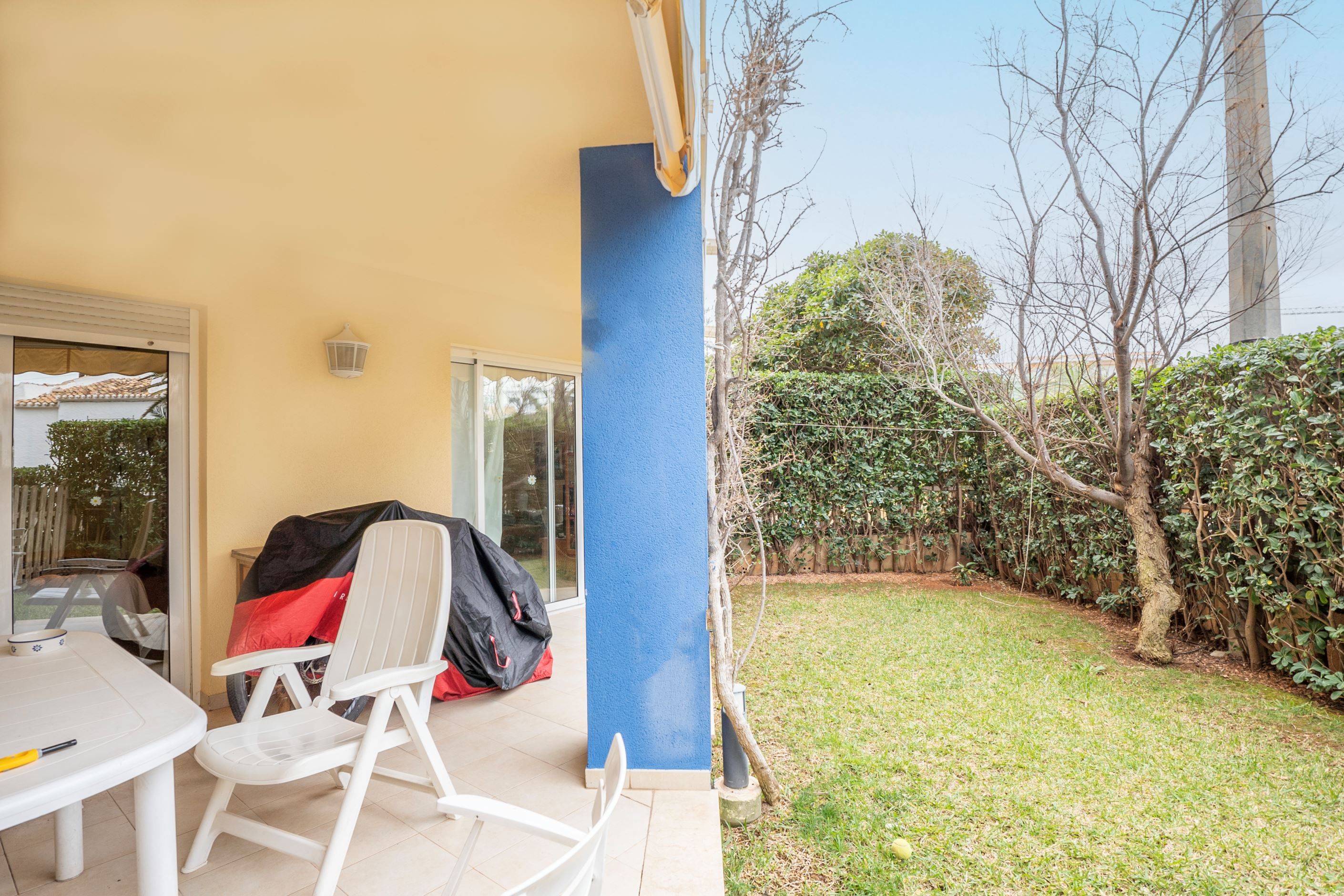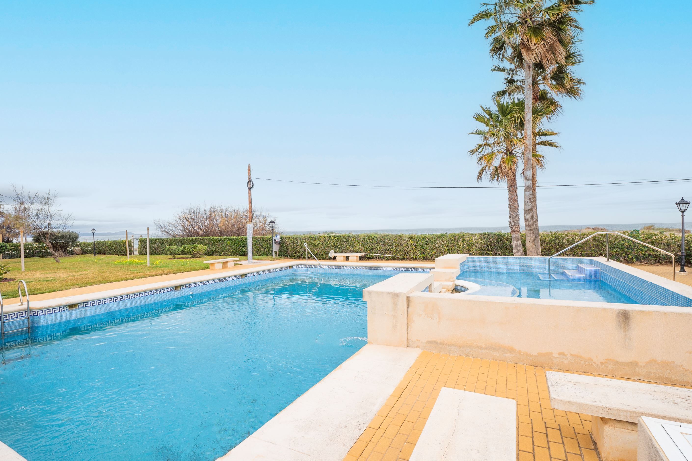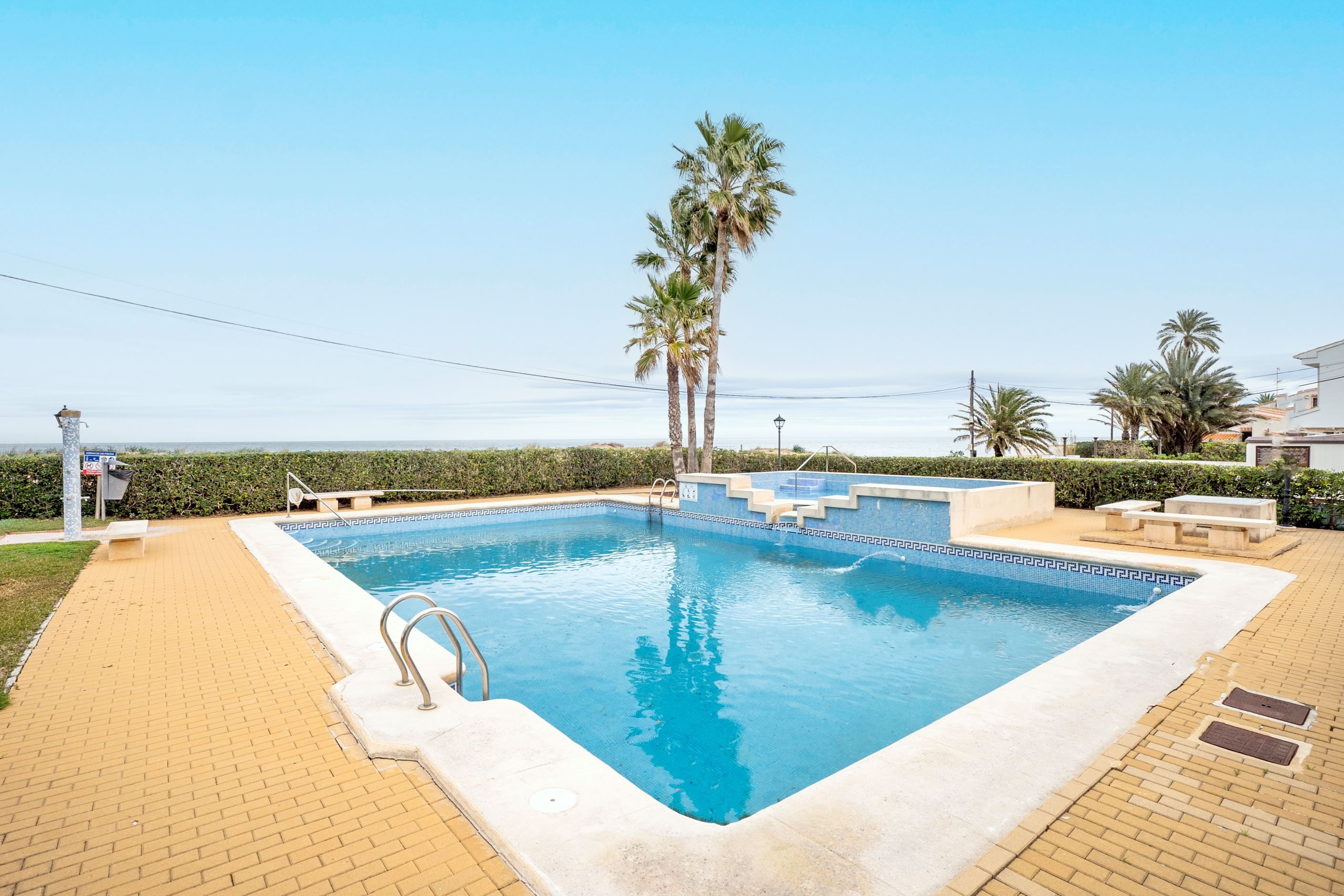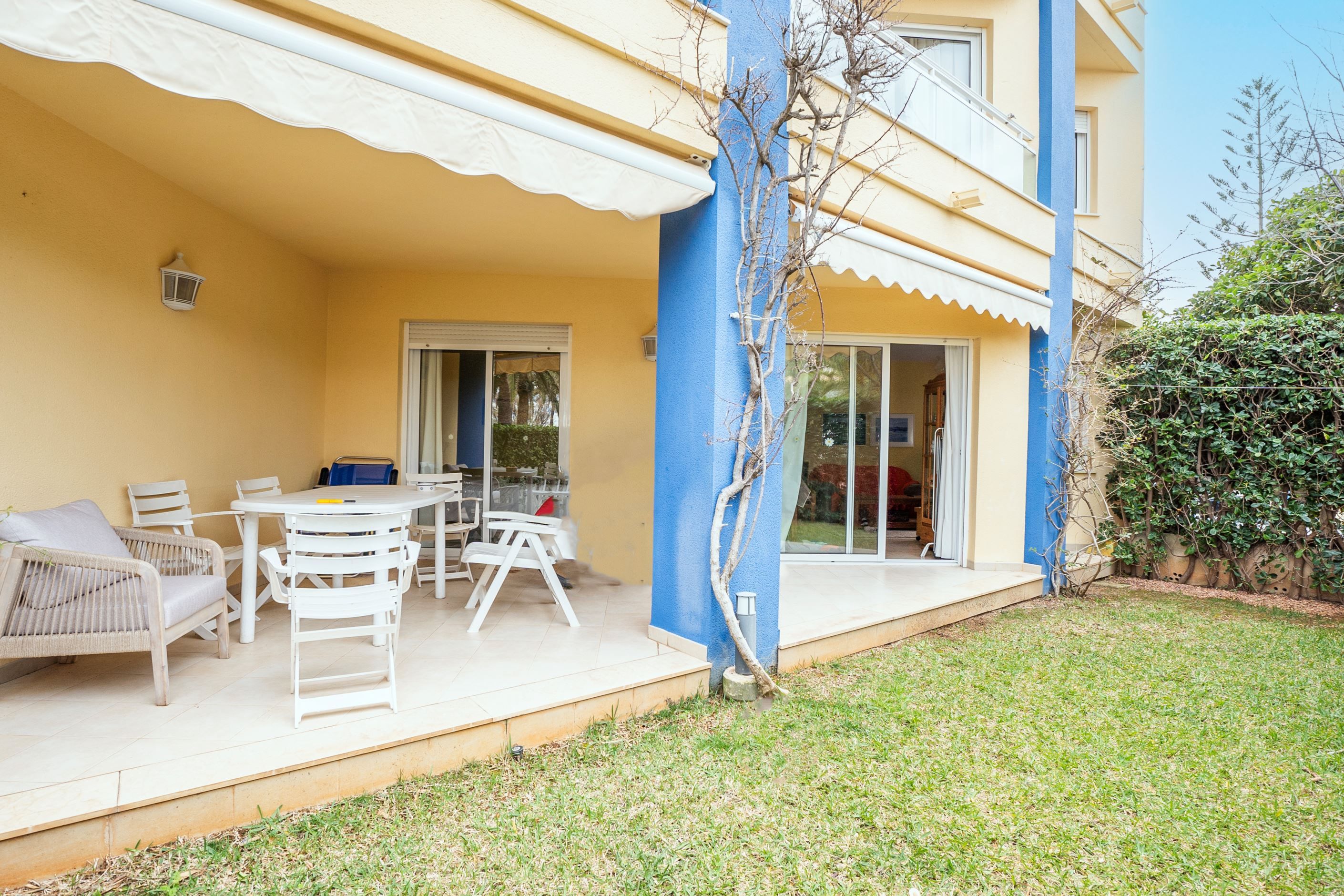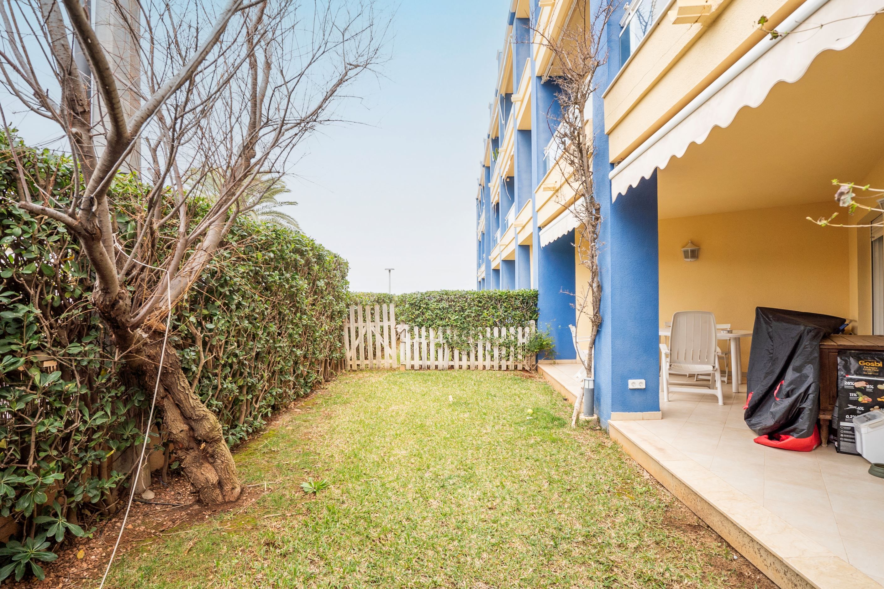 Belägen i första linjen mot havet, i ett välskött och lugnt bostadsområde endast 2 km från centrala Denia, erbjuder denna markplanslägenhet med privat trädgård ett perfekt boende vid Medelhavet. Fastigheten har direkt tillgång till stranden och ligger nära alla bekvämligheter såsom busshållplats vid entrén, stormarknader, restauranger, apotek, sportanläggningar och golfbanor.