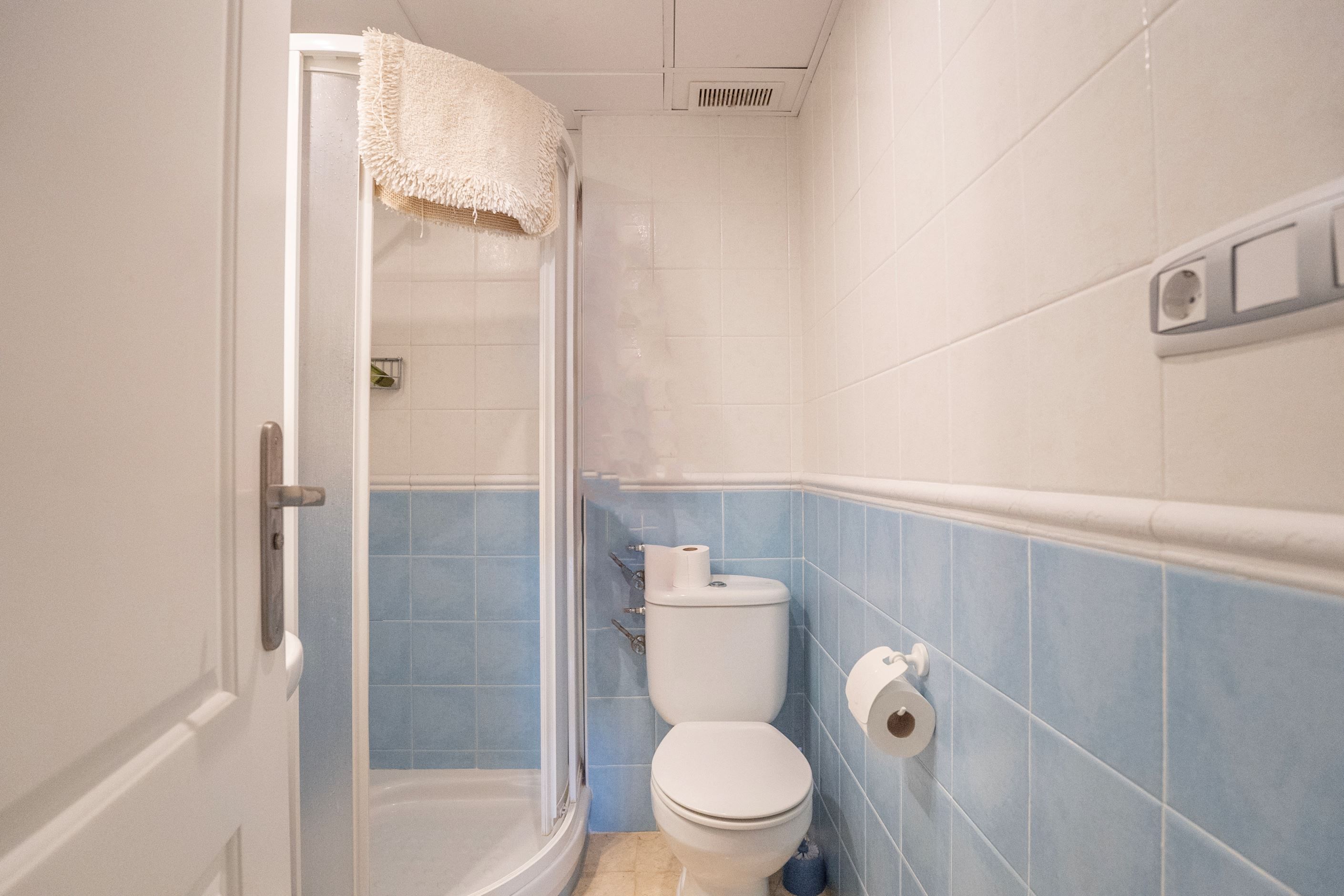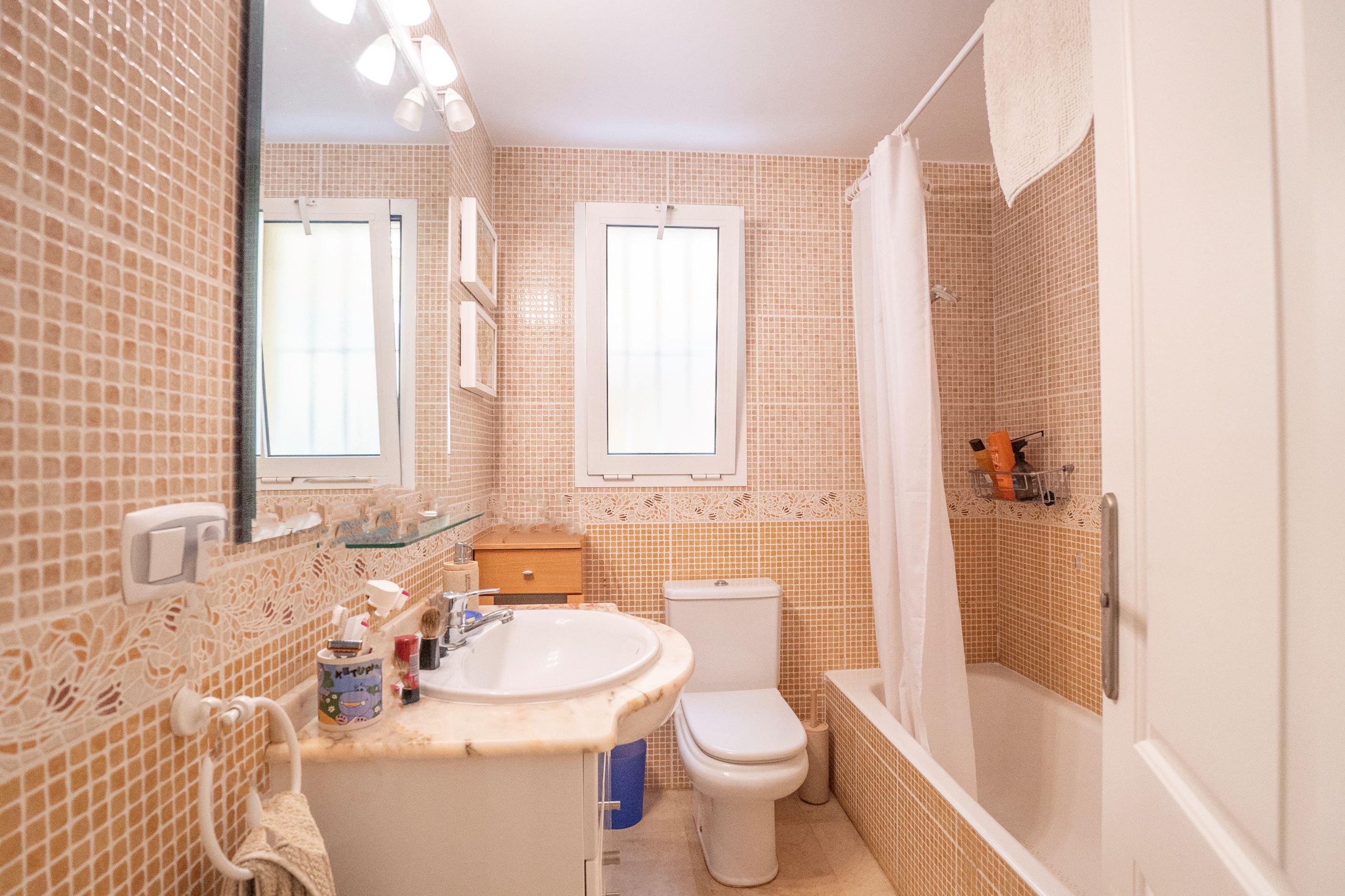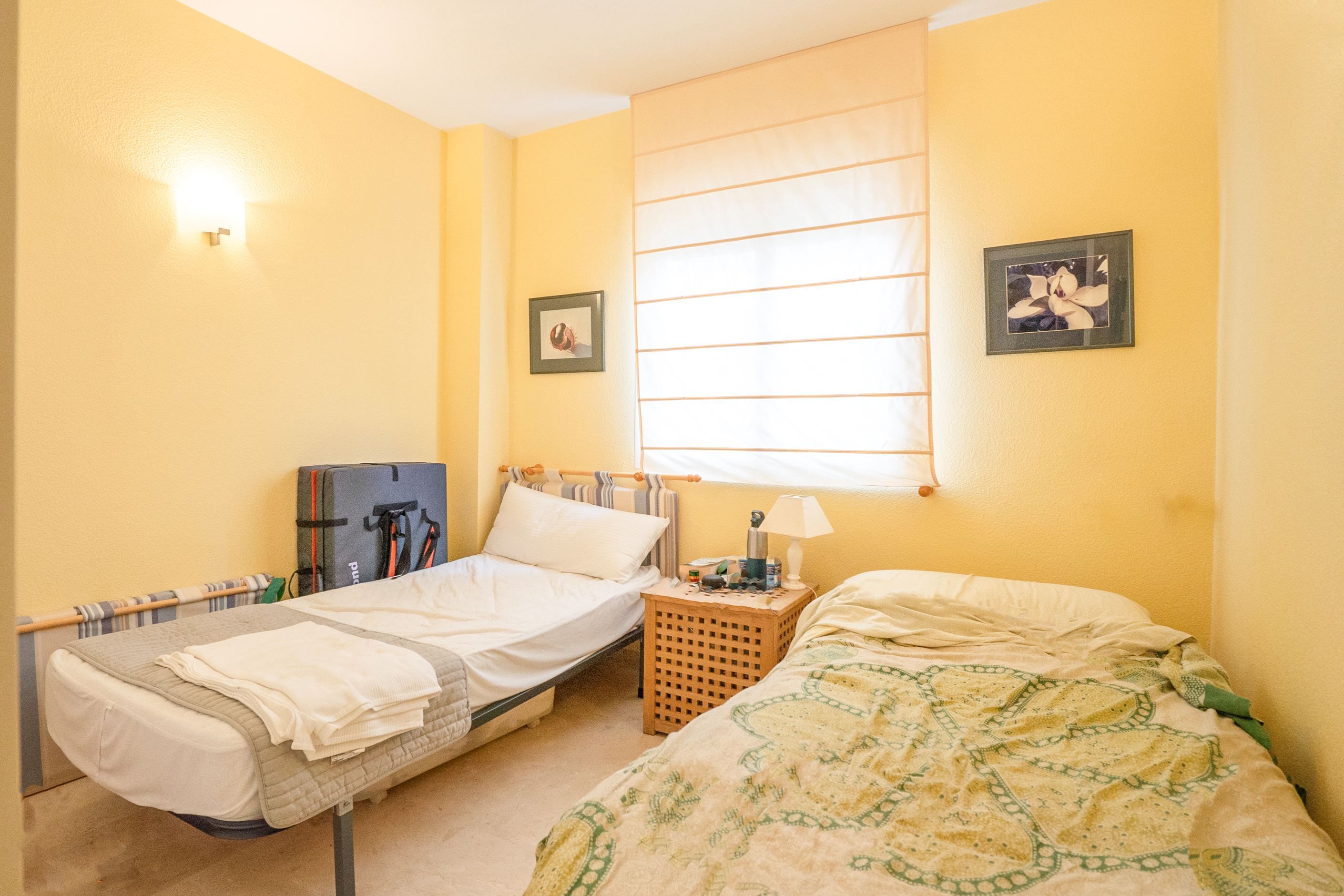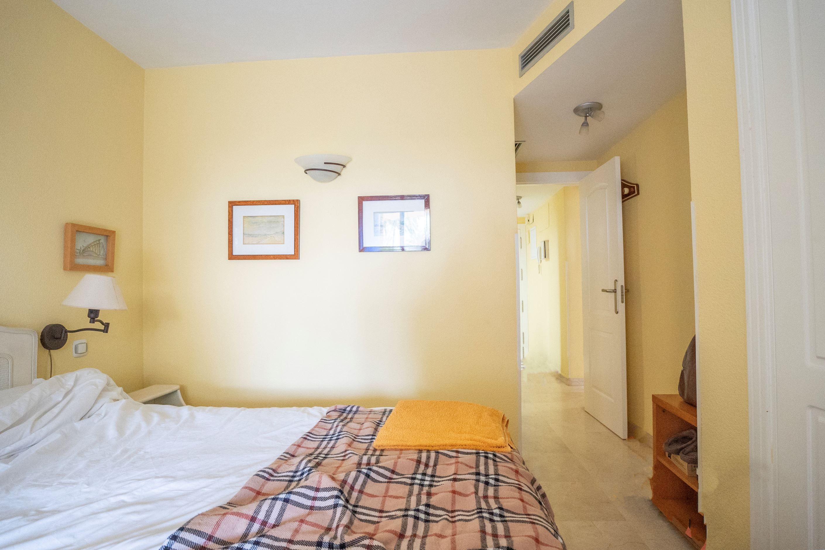 Bostaden består av två dubbelrum med inbyggda garderober och två kompletta badrum, varav ett en-suite i huvudsovrummet med badkar. Separat fullt utrustat kök samt ett ljust och rymligt vardagsrum med direkt utgång till den täckta terrassen och den privata trädgården. Luftkonditionering med värmepump finns installerad i hela bostaden för komfort året runt.