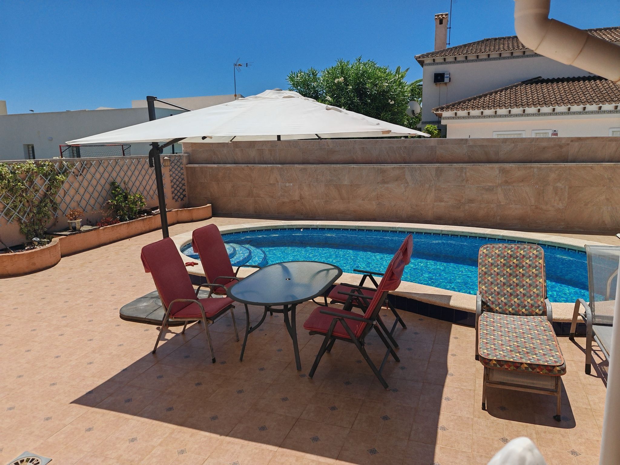 Utomhus väntar en inbjudande pool som glittrar i solens sken, en plats där sommardagar enkelt blir längre och där kvällar i svalare luft kan njutas i total avkoppling. Terrassen och balkongerna ger flera fina miljöer för både privat vila och sociala stunder – från morgonkaffe i stillhet till middagar under bar himmel när temperaturen sjunker och omgivningen blir mjukare. Trädgårdens ytor är lättskötta men tillräckligt stora för att skapa egna små gröna projekt eller bara för att njuta av känslan av att ha sitt eget privata utomhusrum.