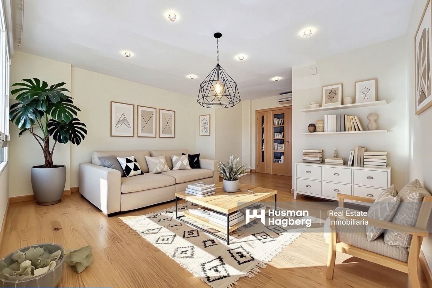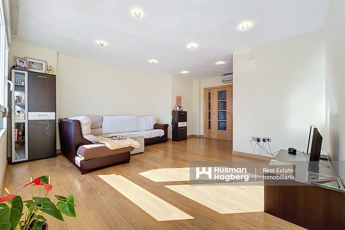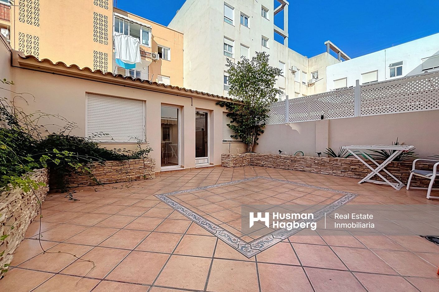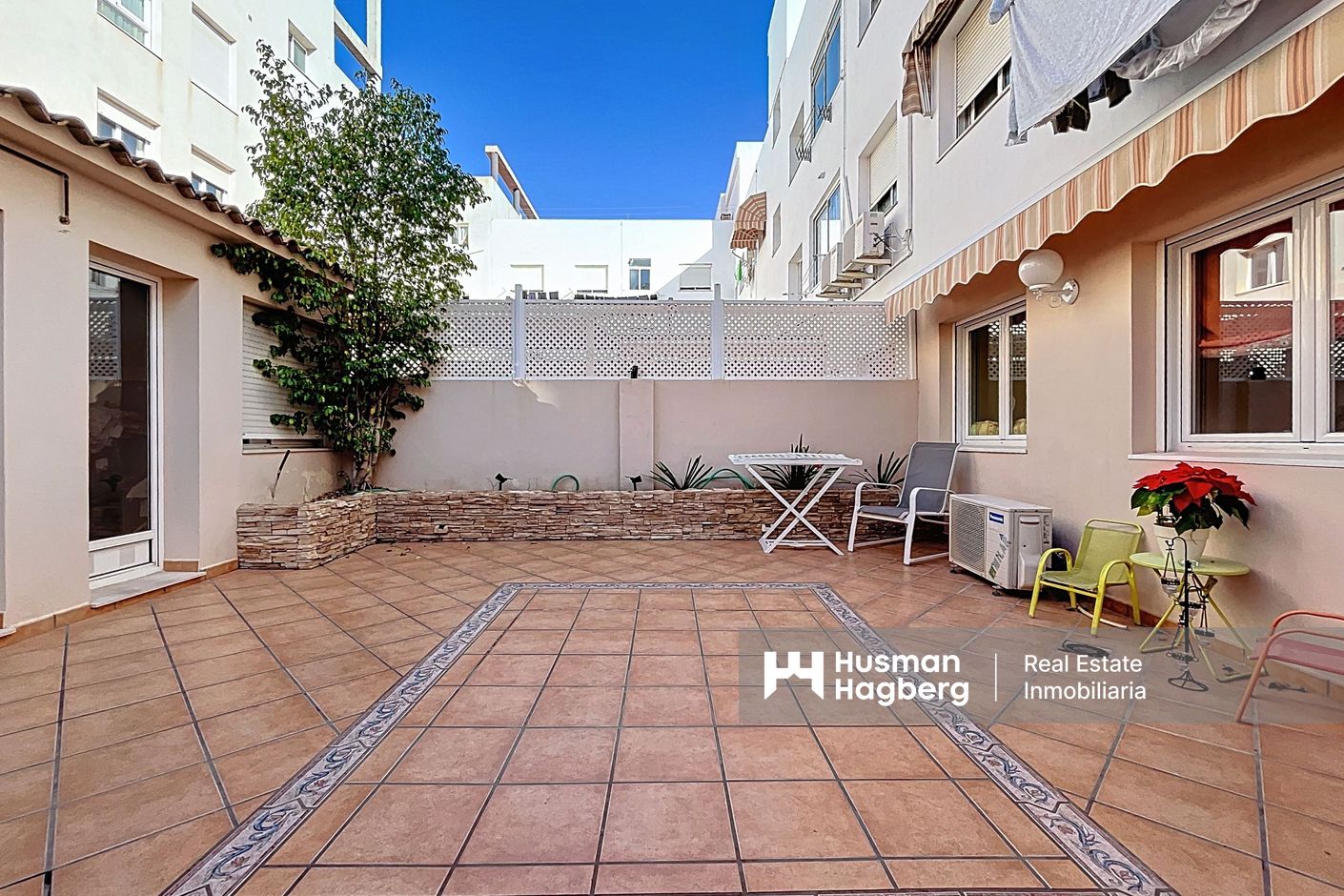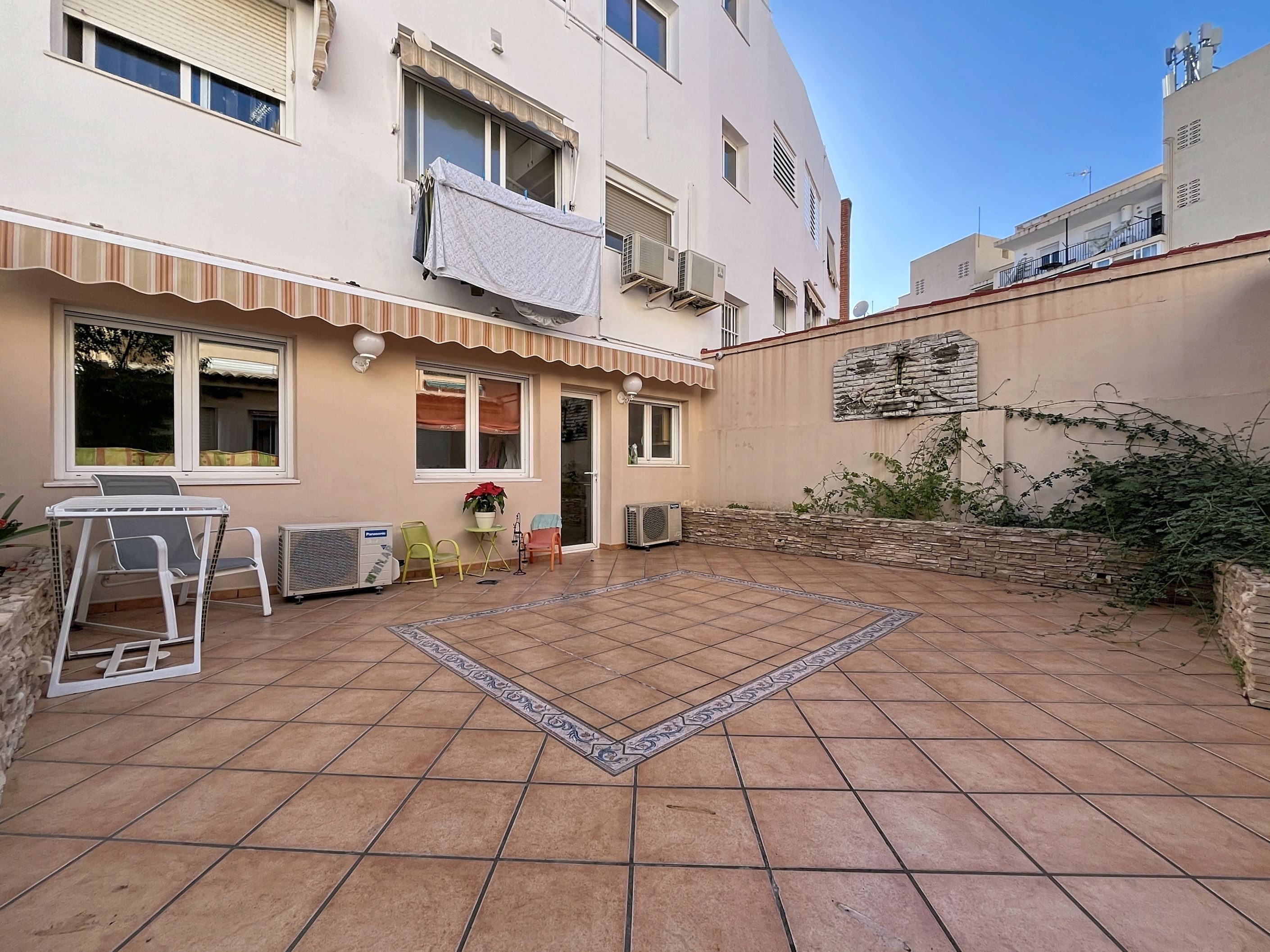 Bostaden är delvis renoverad och har en ljus och funktionell planlösning. Den består av hall, helt renoverat kök med tillgång till innergård, rymligt vardagsrum med matplats, tre sovrum och två badrum varav ett en-suite. Från terrassen finns tillgång till förråd och mindre tvättutrymme, vilket ger extra praktisk yta.
