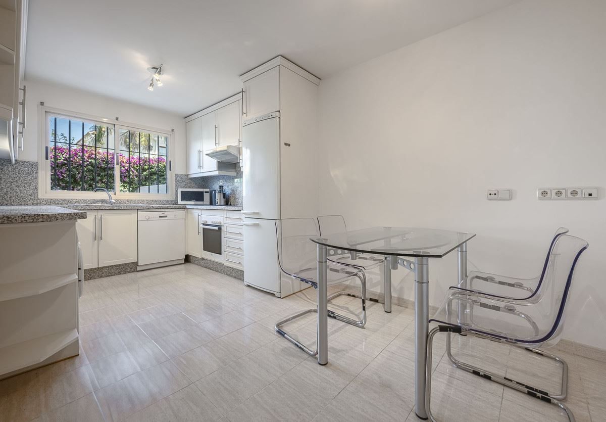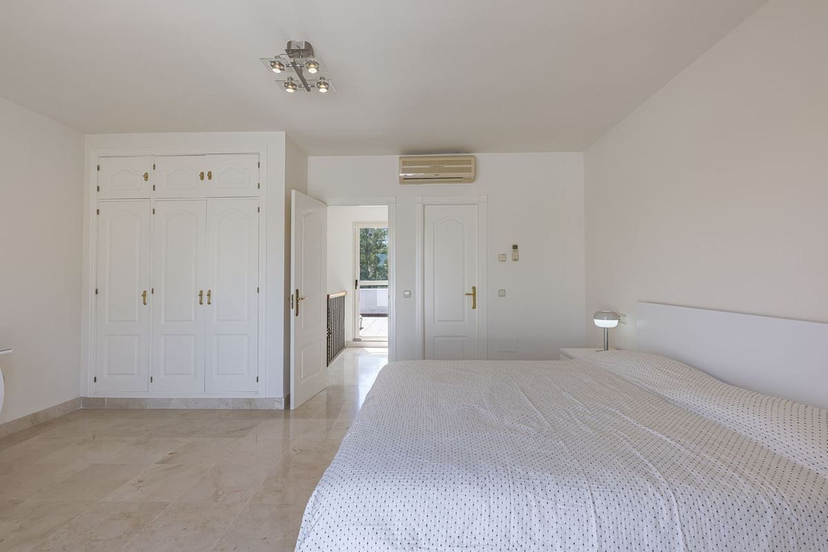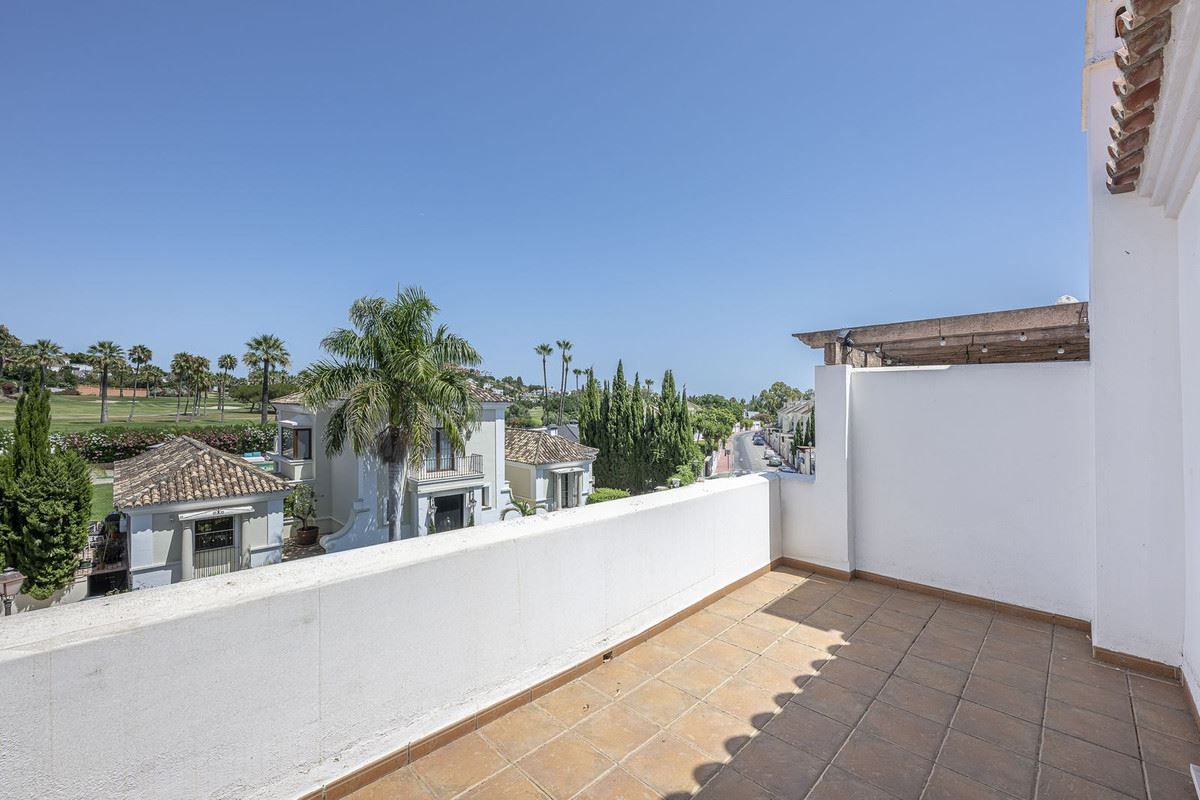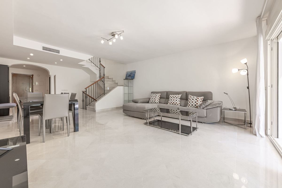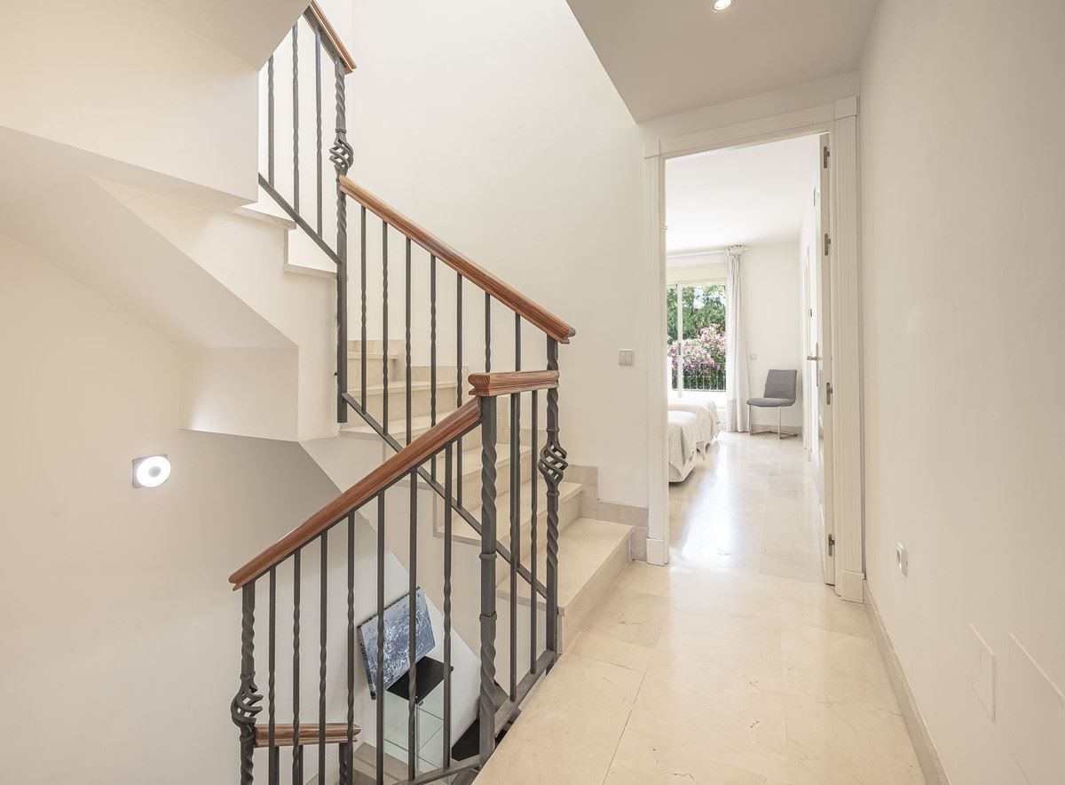 Elegant familjeradhus i hjärtat av Nueva Andalucía, Marbella Golf Valley. Välkommen till detta vackert underhållna och rymliga radhus, idealiskt beläget i den prestigefyllda Golf Valley i Nueva Andalucía. Detta hus i fyra våningar kombinerar komfort, stil och bekvämlighet – perfekt för familjeboende eller som en lyxig semester. Bottenvåningen välkomnar dig med en solig uteplats som leder till ett stort, fullt utrustat separat kök. Det generösa vardagsrummet och matsalen med öppen planlösning flyter sömlöst in i en västläge terrass och privat trädgård, med direkt tillgång till den gemensamma poolen – perfekt för avkoppling eller underhållning. En gästtoalett gör denna våning praktisk. På första våningen hittar du två generöst tilltagna sovrum, alla med eget badrum och privat terrass, som erbjuder lugna tillflyktsorter med gott om naturligt ljus. Översta våningen har ett rymligt sovrum med eget badrum, en stor terrass med panoramautsikt över golfbanan och ett soligt västläge solarium för lugna kvällar. Den stora källaren med naturligt ljus är ett mångsidigt utrymme, perfekt för ytterligare ett sovrum, hemmabio, lekrum, kontor eller musikstudio. Det inkluderar också ett gästbadrum, en tvättstuga och direkt tillgång till ett underjordiskt privat garage med plats för två fordon. Huset är byggt med material och ytbehandlingar av bästa kvalitet. Beläget i ett exklusivt och privat komplex med väldigt få grannar. Njut av lugnet i de vackert anlagda trädgårdarna, poolen och gymmet. Bara en kort bilresa från Puerto Banús och Marbella, det är ett oslagbart läge för golfälskare och de som söker det bästa av Costa del Sol-livet. Inflyttningsklart - missa inte denna exceptionella möjlighet! Total byggd boyta: 421,62 m2