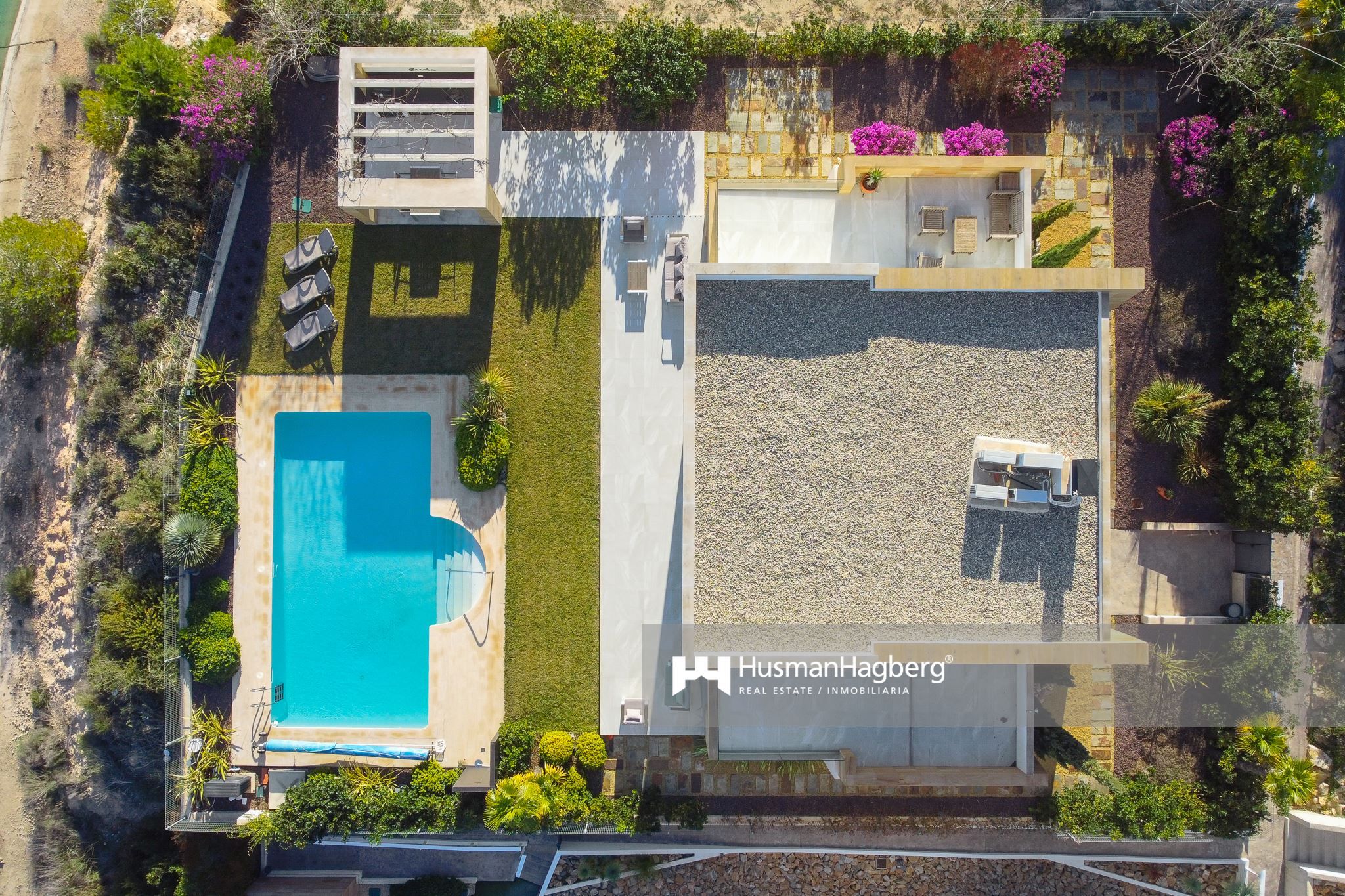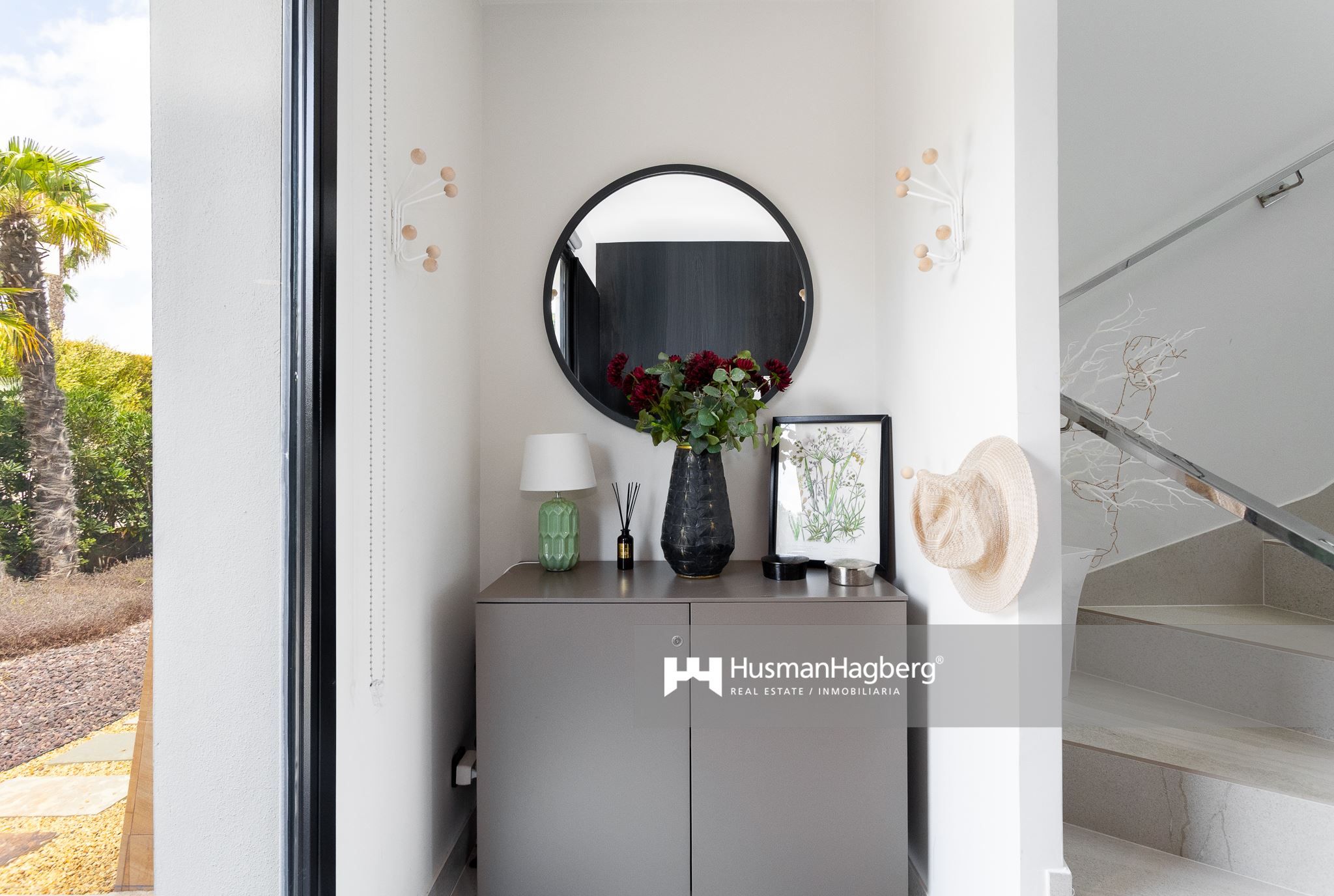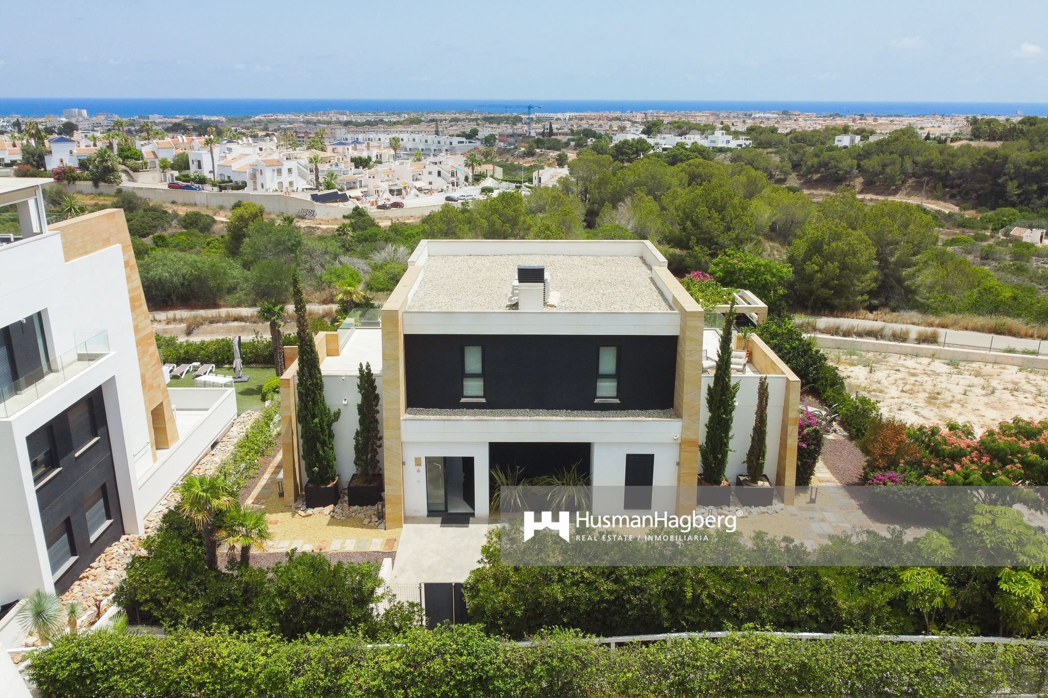 Bostaden breder ut sig över två plan och erbjuder fem sovrum, tre badrum samt generösa sällskapsytor med öppen planlösning. Redan när du kliver in möts du av ljusinsläppet från de stora panoramafönstren som vetter ut mot trädgården – ett grönt och inbjudande uterum där medelhavslivets själ får blomstra.