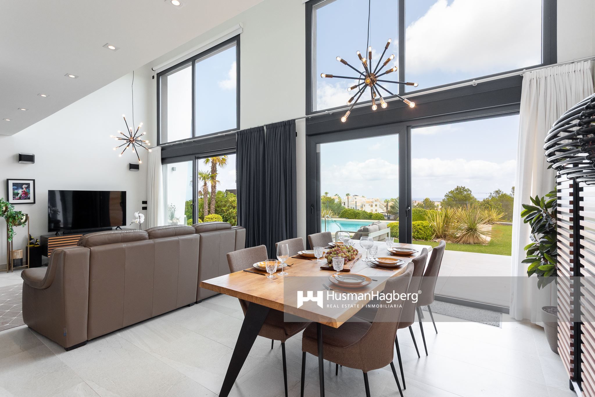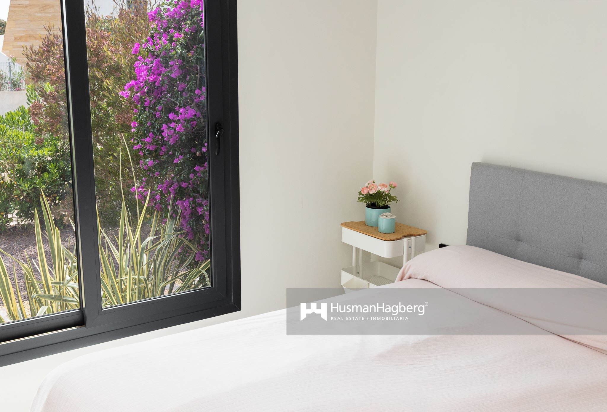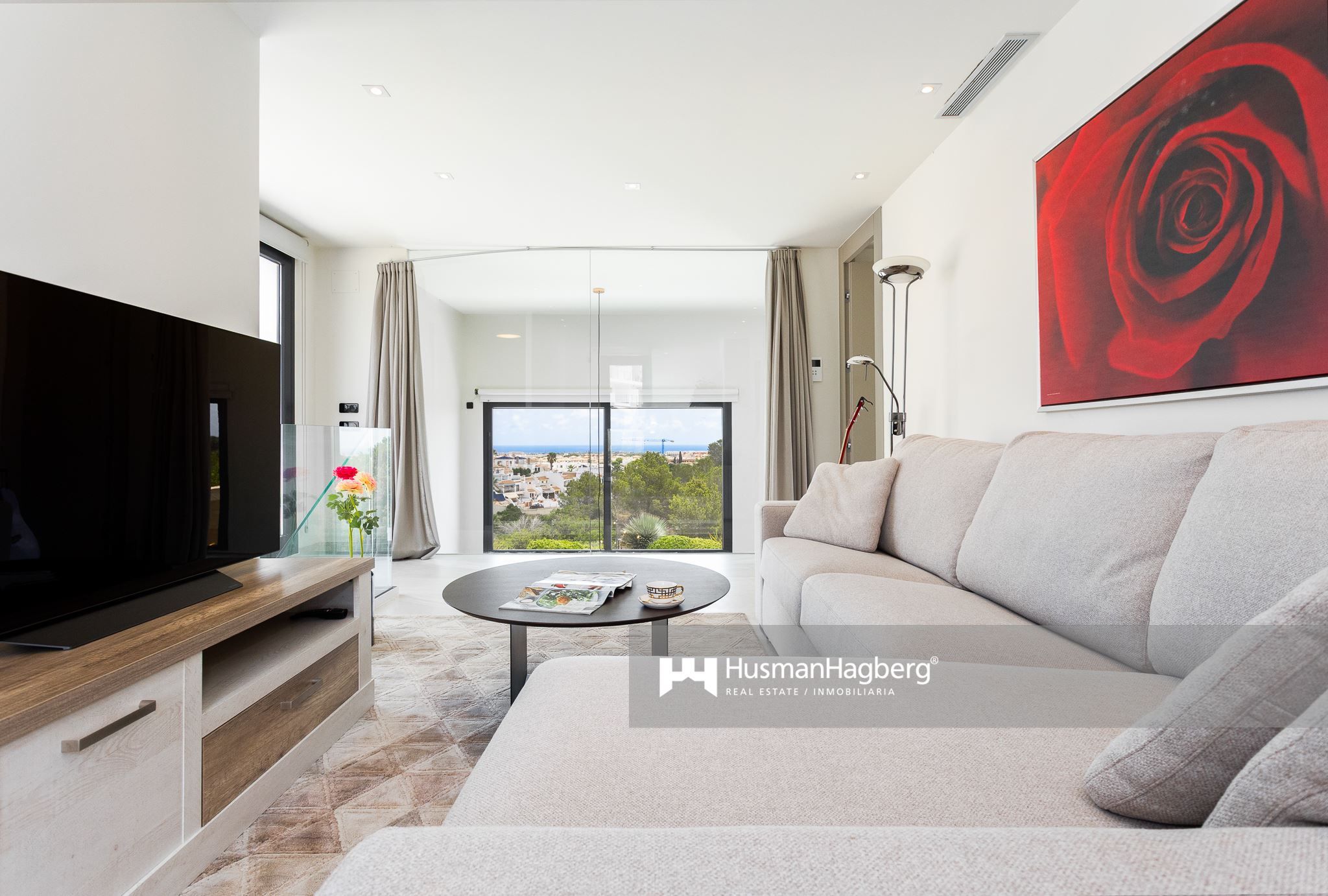 Bostaden breder ut sig över två plan och erbjuder fem sovrum, tre badrum samt generösa sällskapsytor med öppen planlösning. Redan när du kliver in möts du av ljusinsläppet från de stora panoramafönstren som vetter ut mot trädgården – ett grönt och inbjudande uterum där medelhavslivets själ får blomstra.