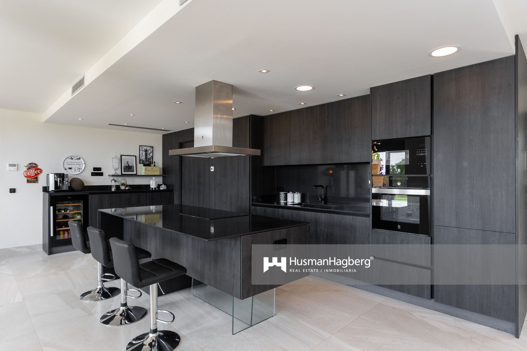Huset håller genomgående hög standard, med materialval som kombinerar stil och komfort. Här finns golvvärme i hela huset, inbyggd luftkonditionering och generösa fönsterpartier som suddar ut gränsen mellan ute och inne.