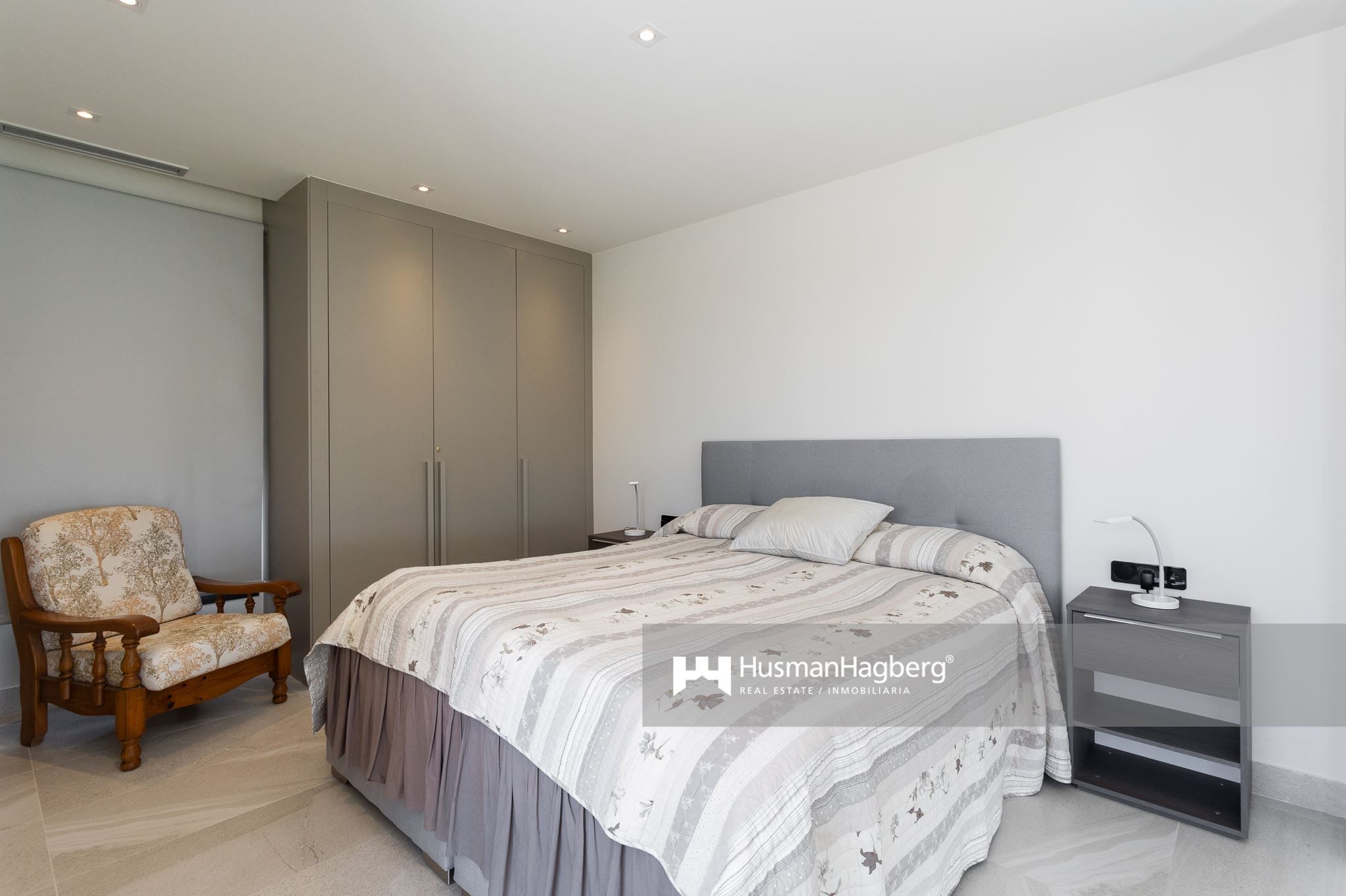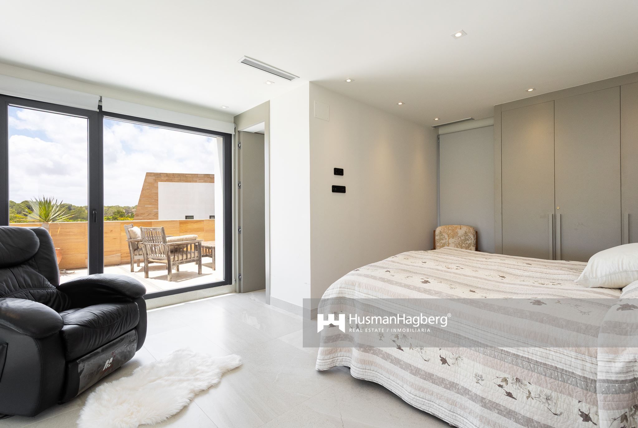 På entréplanet finns fyra ljusa och rofyllda sovrum samt två badrum, placerade praktiskt på varsin sida av huset för både funktion och integritet. En trappa upp väntar ett mysigt tv-rum och det eleganta master bedroom med eget badrum och direkt tillgång till en av två takterrasser. Den ena badar i mjuk morgonsol – perfekt för frukoststunden – medan den andra bjuder på strålande kvällssol och utsikt över havet, en idealisk plats att avsluta dagen med ett glas vin och blicka ut över landskapet.