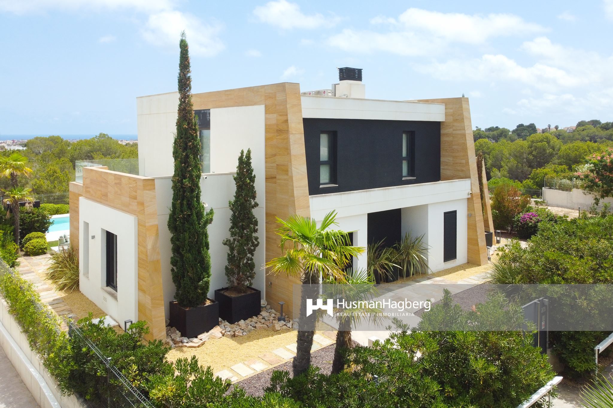 En modern oas med havsutsikt och medelhavscharm