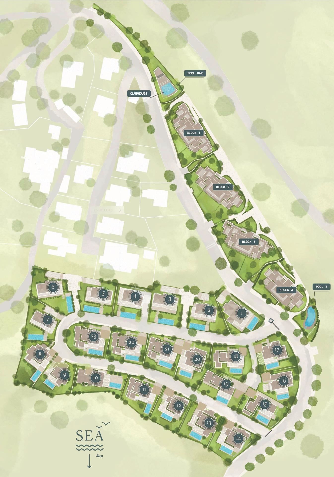 Villor: Rymliga planlösningar med 4, 5 eller 6 sovrum, privata pooler, lummiga trädgårdar och alternativ för en eller två våningar ovanför marknivån. Varje villa har ett underjordiskt utrymme för extra funktionalitet.