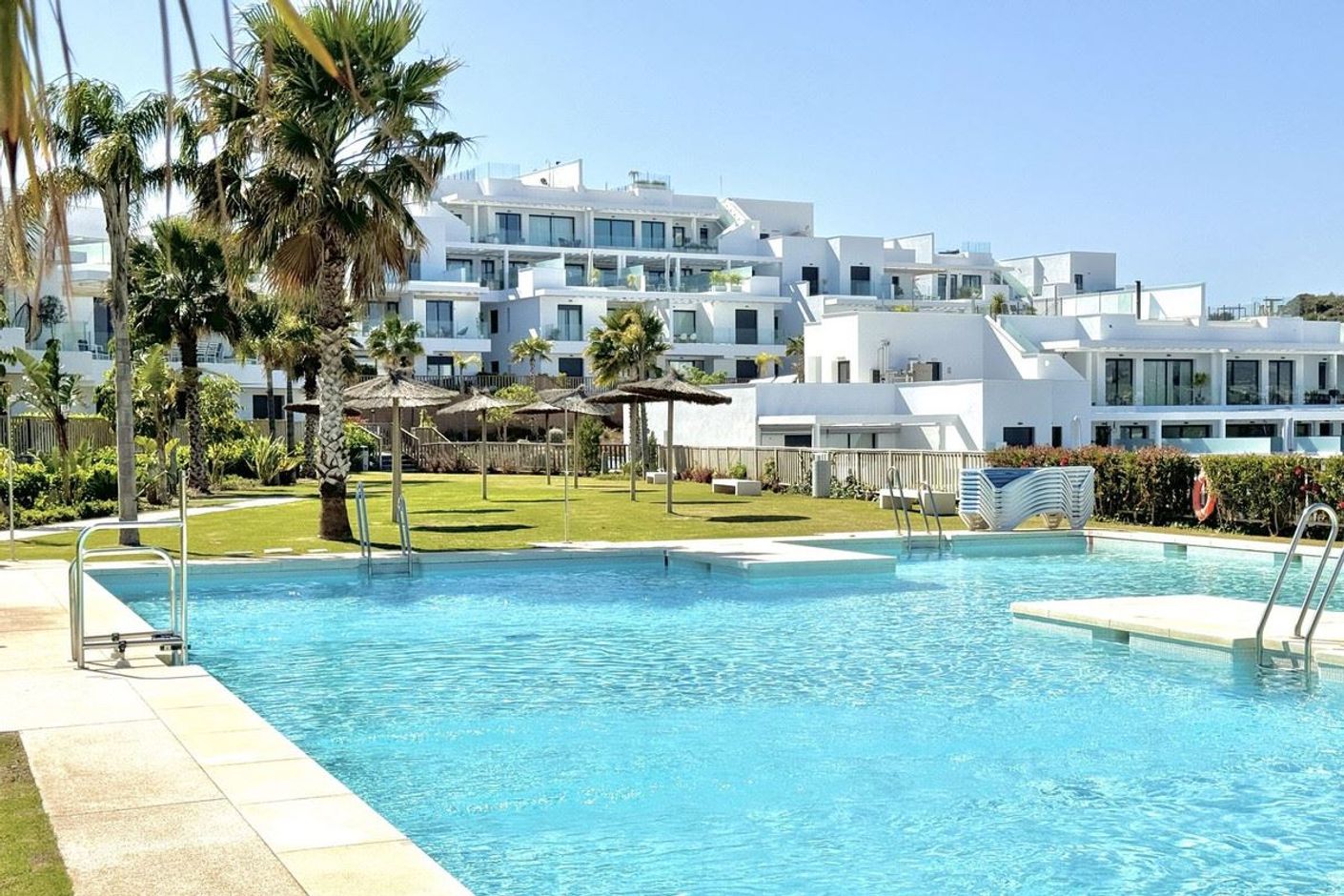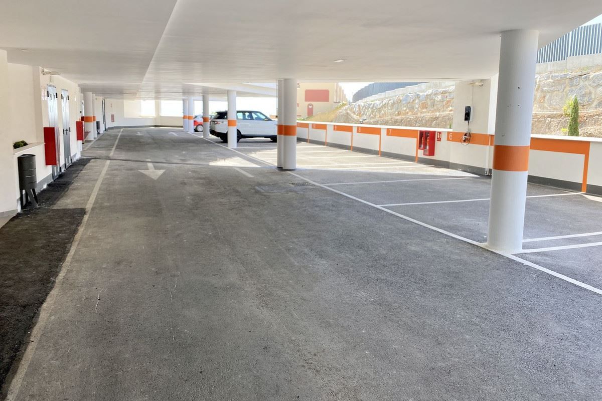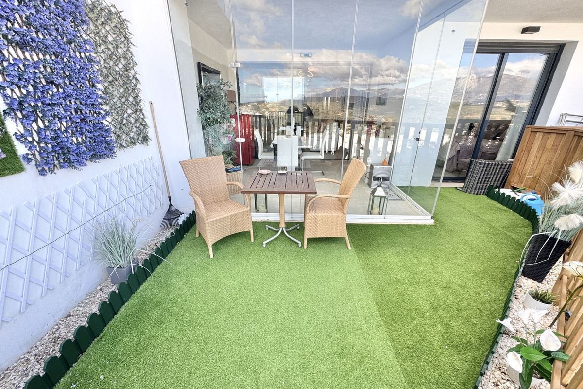 Denna moderna lyxlägenhet erbjuder; rymligt vardagsrum/matsal med stort öppet modernt vitt högglans kök. Med inbyggd ugn, spis, fläktkåpa, kyl och frys, mikrovågsugn. 3 stora dubbelrum med inbyggda garderober, Master med altandörrar till terrass, walk-in-garderob och lyxigt duschrum. Plus ett andra familjeduschrum. Täckt terrass (nu med glasgardiner) och privat trädgård med utsikt över komplexet med bergsutsikt och delvis havsutsikt. Varm och kall luftkonditionering, privat parkeringsplats och förråd. Interiören har en vacker tidlös design med högkvalitativa ytbehandlingar och neutrala färgpaletter.