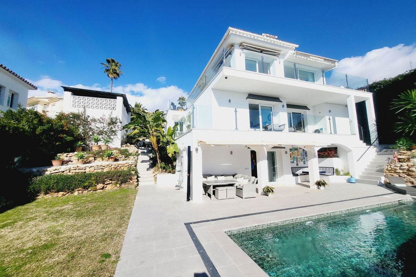 Vackert presenterad villa i eftertraktade lägre Riviera med enastående havsutsikt. Fastigheten har uppdaterats av de nuvarande ägarna med bland annat ett stilrent nytt kök, moderna räcken i glas och krom, en renoverad gäststudio med eget kök och duschrum samt en ny pool med generösa terrasser i en lättskött, anlagd trädgård.