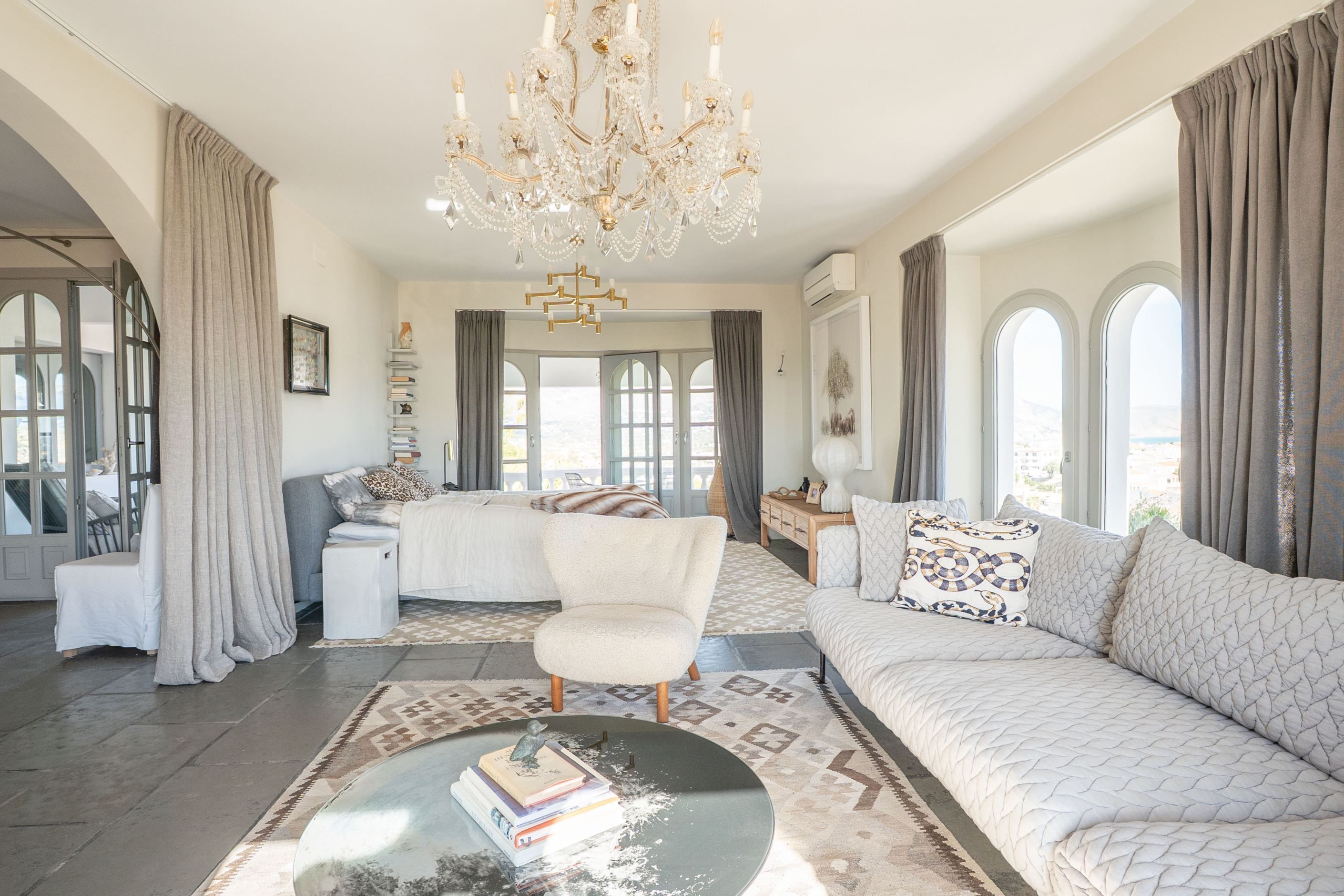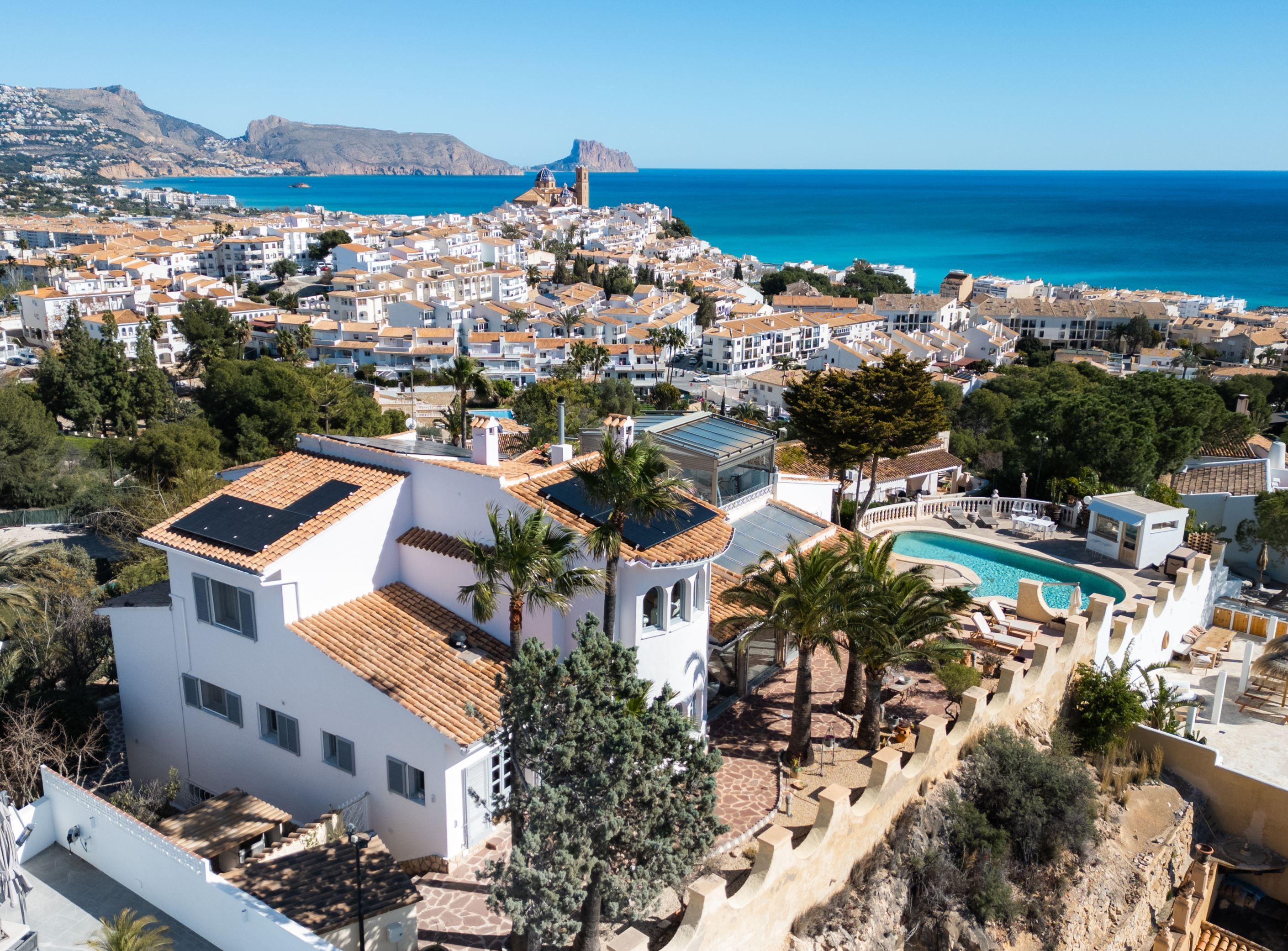 Belägen i ett av de mest privilegierade lägena i Altea erbjuder denna exceptionella villa en spektakulär panoramautsikt över Medelhavet och den ikoniska kyrkan i Alteas gamla stad. Fastigheter som kombinerar havsutsikt, privatliv och gångavstånd till den historiska stadskärnan är mycket sällsynta. Från huset kan du enkelt promenera till Alteas charmiga gator, restauranger, butiker och stranden, samtidigt som du njuter av total lugn och avskildhet.