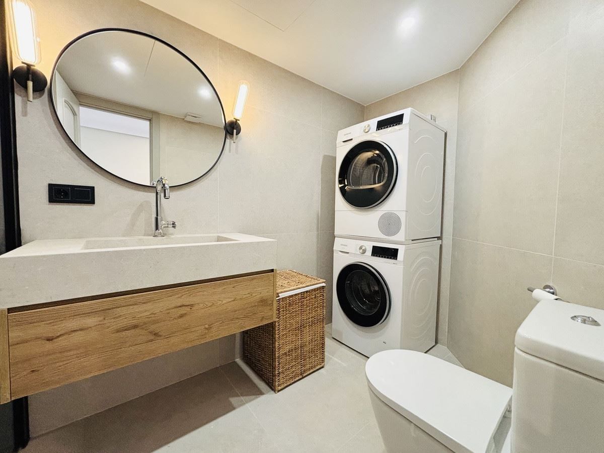 Inuti hittar du ett ljust och luftigt vardagsrum med dubbel tillgång till båda rymliga terrasserna – perfekt för avkopplande frukostar och uteserveringar. Det separata, fullt utrustade köket är generöst tilltaget, och alla tre sovrummen har inbyggda garderober. Två av sovrummen erbjuder direkt tillgång till olika terrasser. Komfort garanteras året runt med kall/varm luftkonditionering i varje rum.