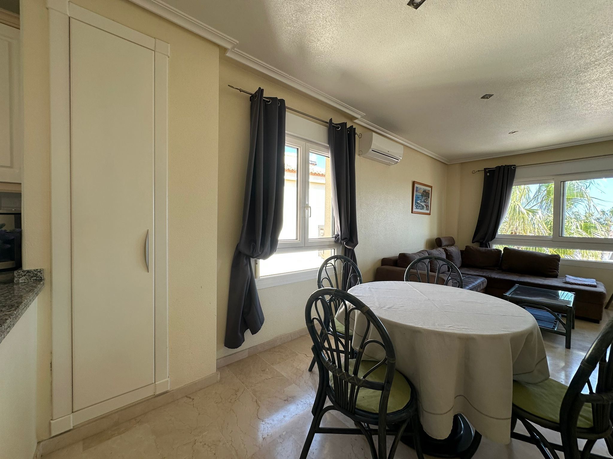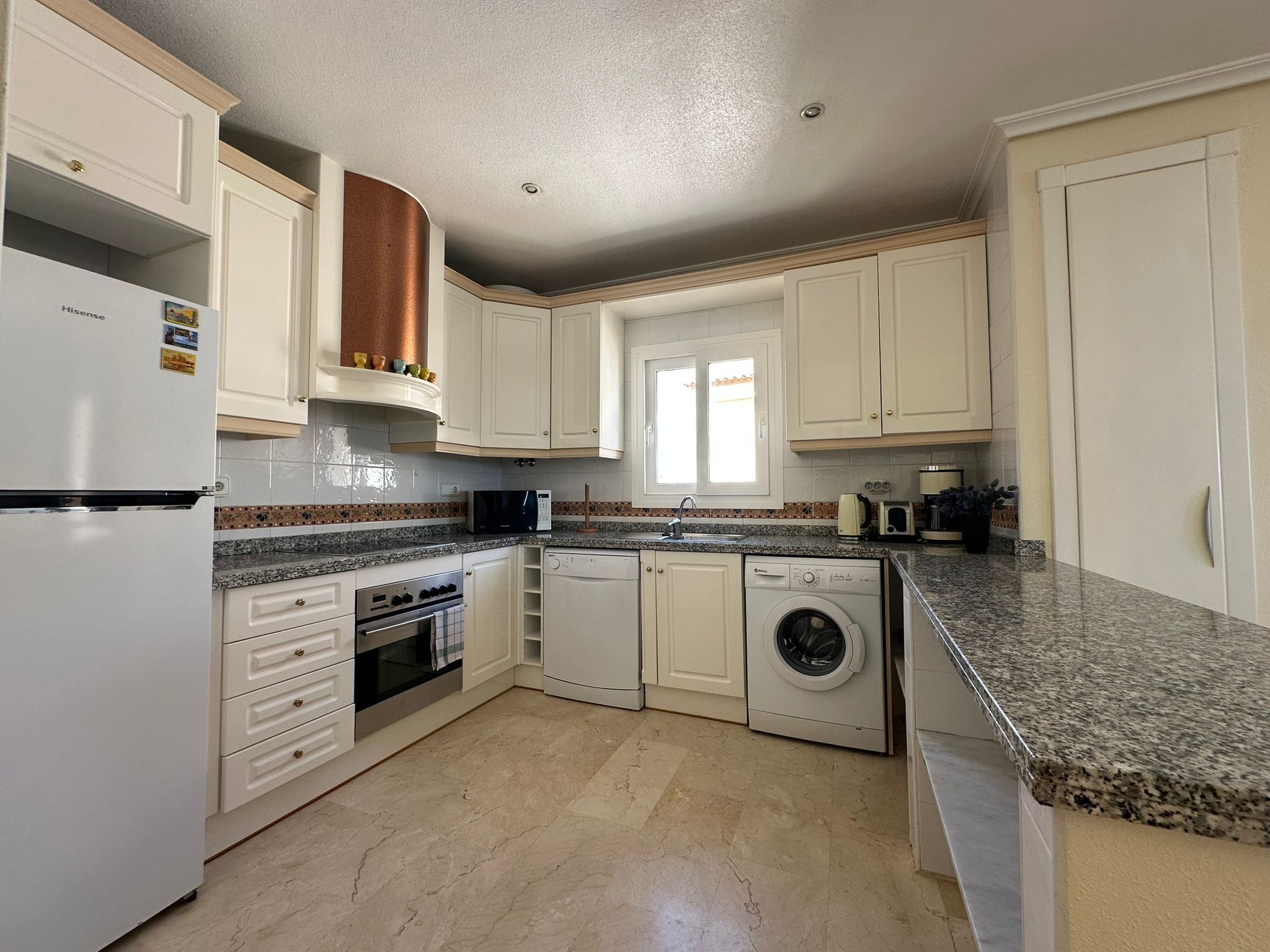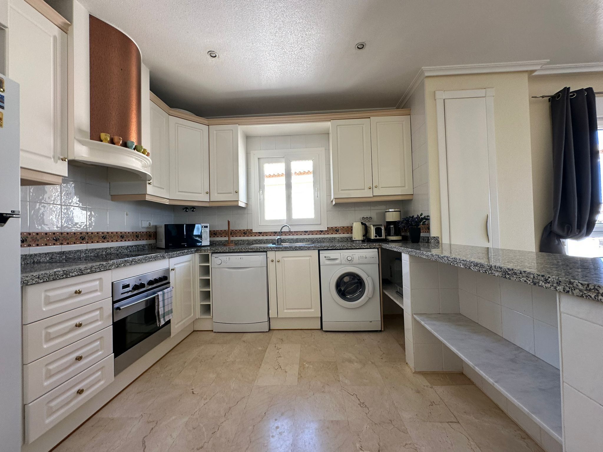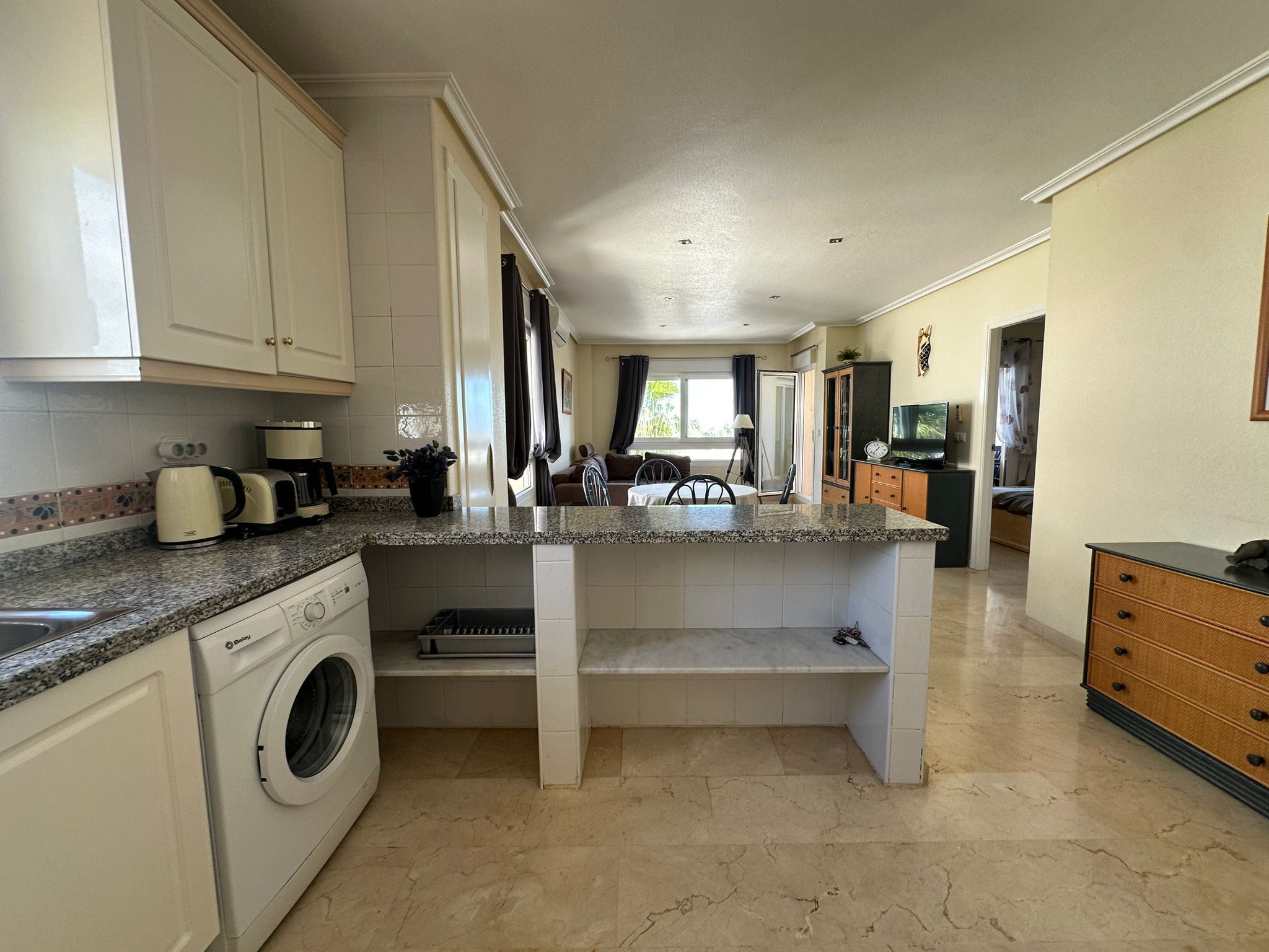 Köket är praktiskt och fullt utrustat för vardagens behov, och lägenheten har både luftkonditionering och tvättmaskin, vilket gör livet bekvämt året runt.