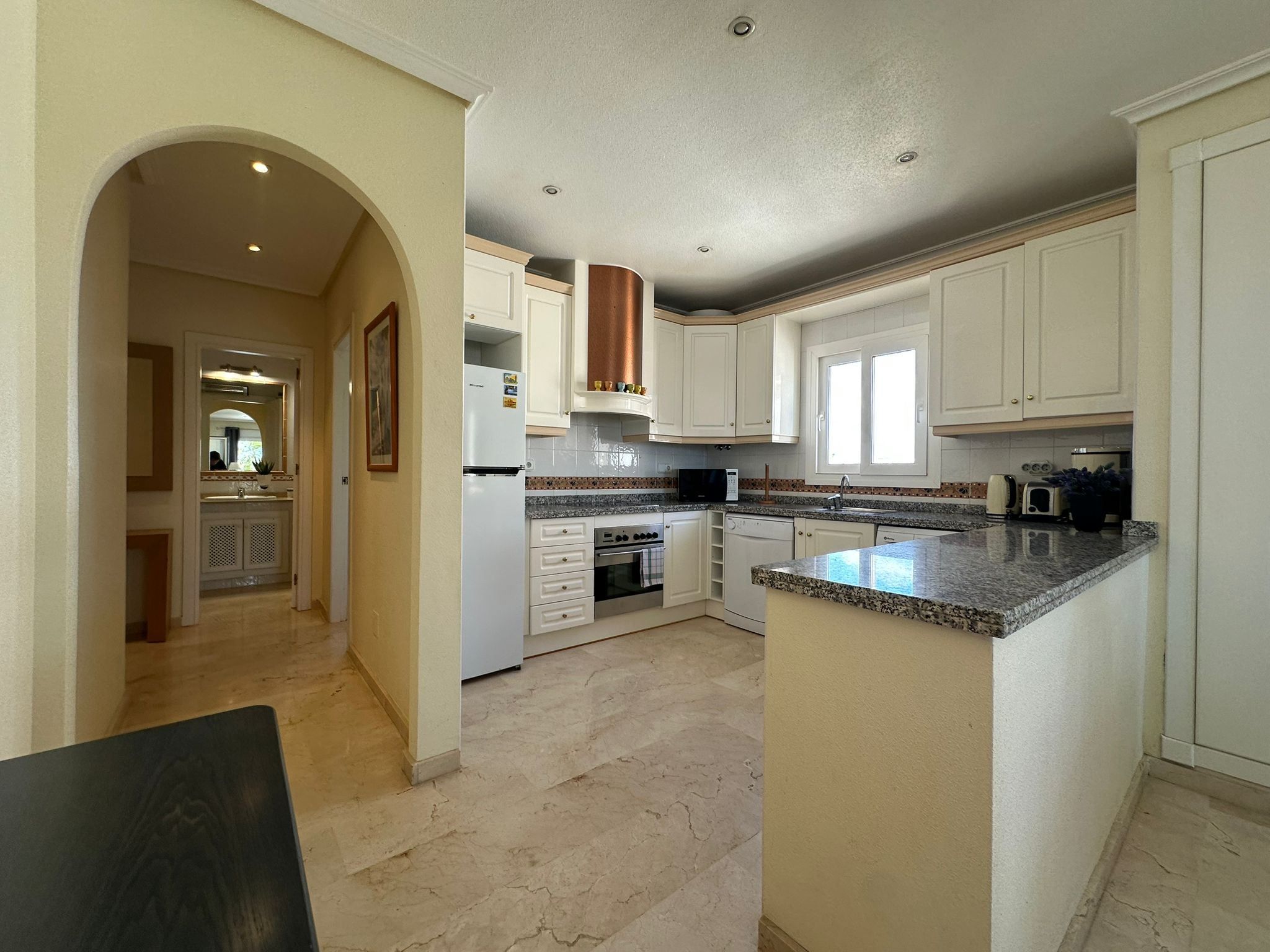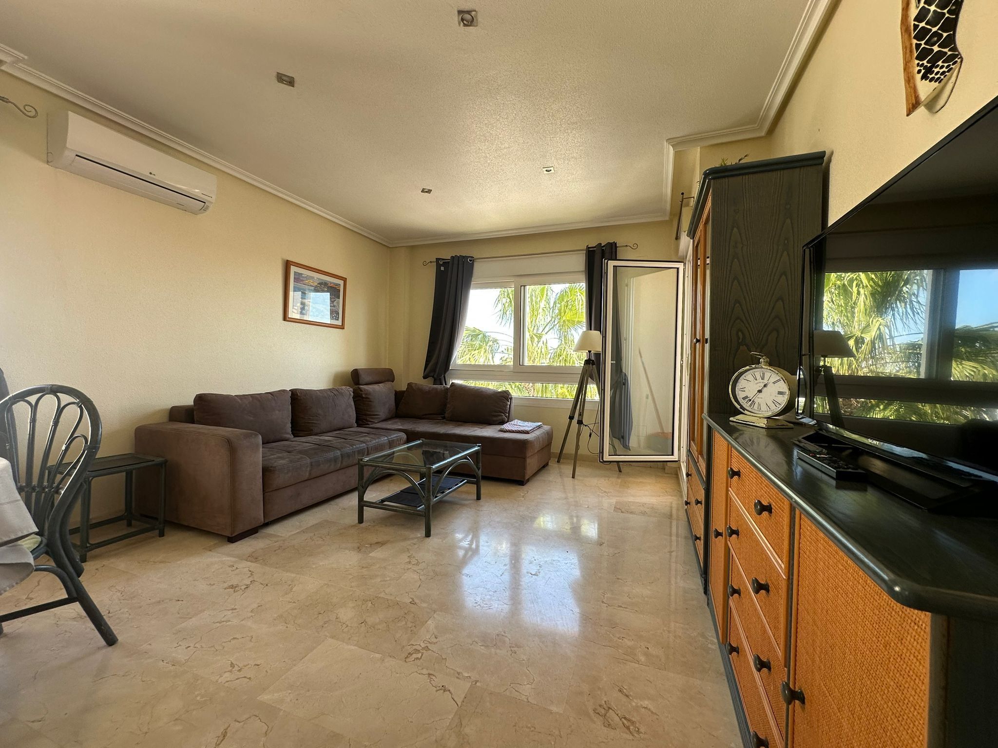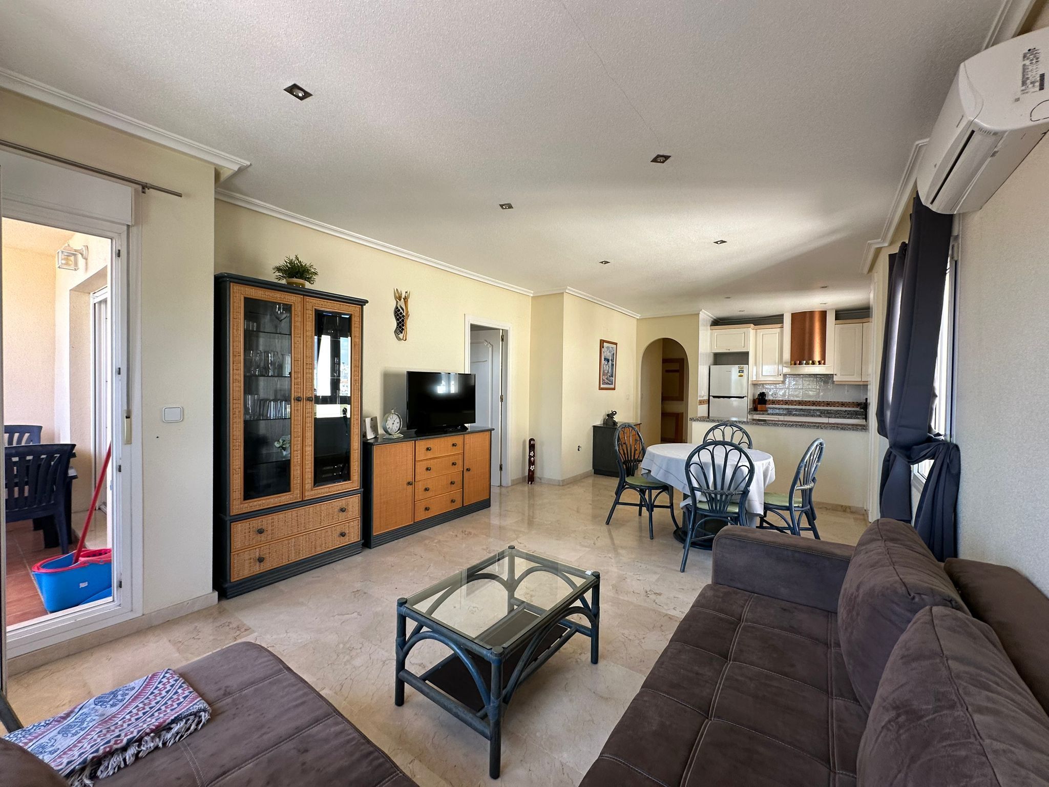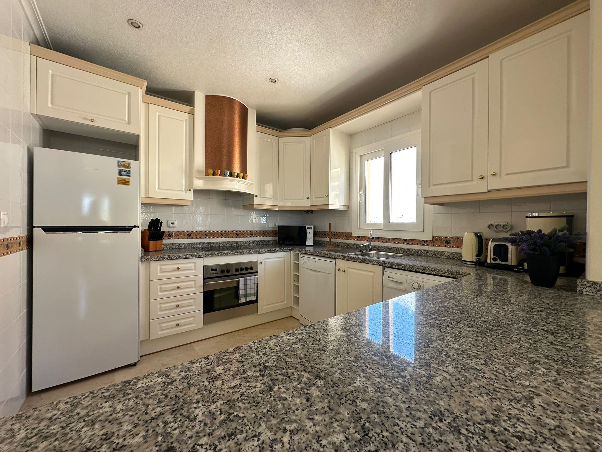 Köket är praktiskt och fullt utrustat för vardagens behov, och lägenheten har både luftkonditionering och tvättmaskin, vilket gör livet bekvämt året runt.