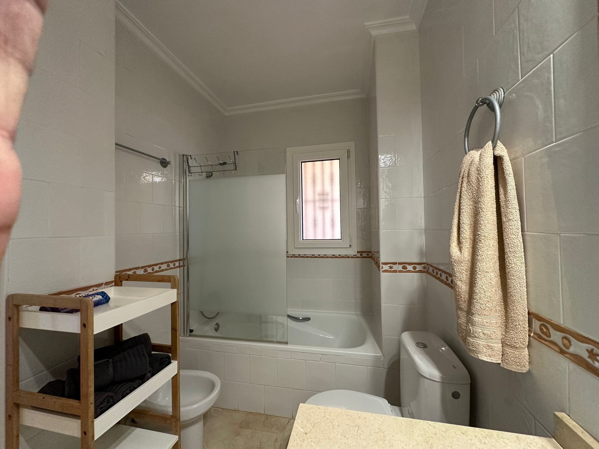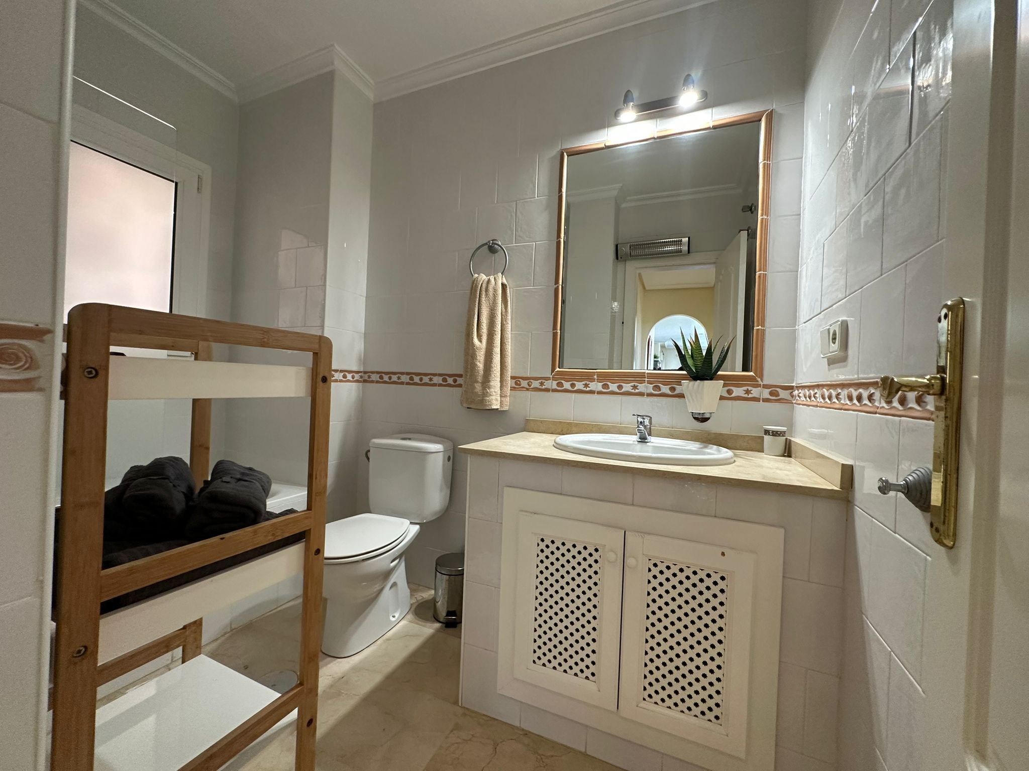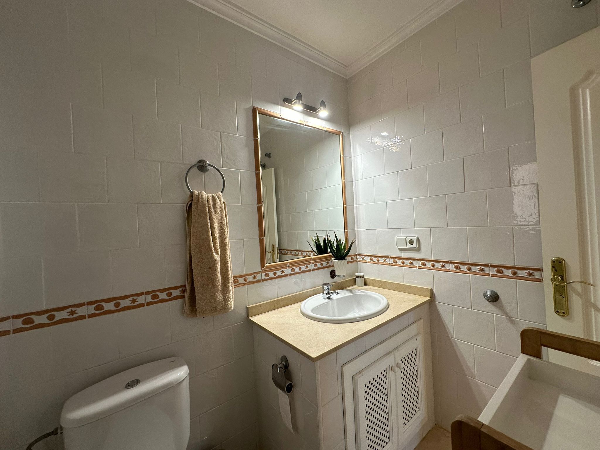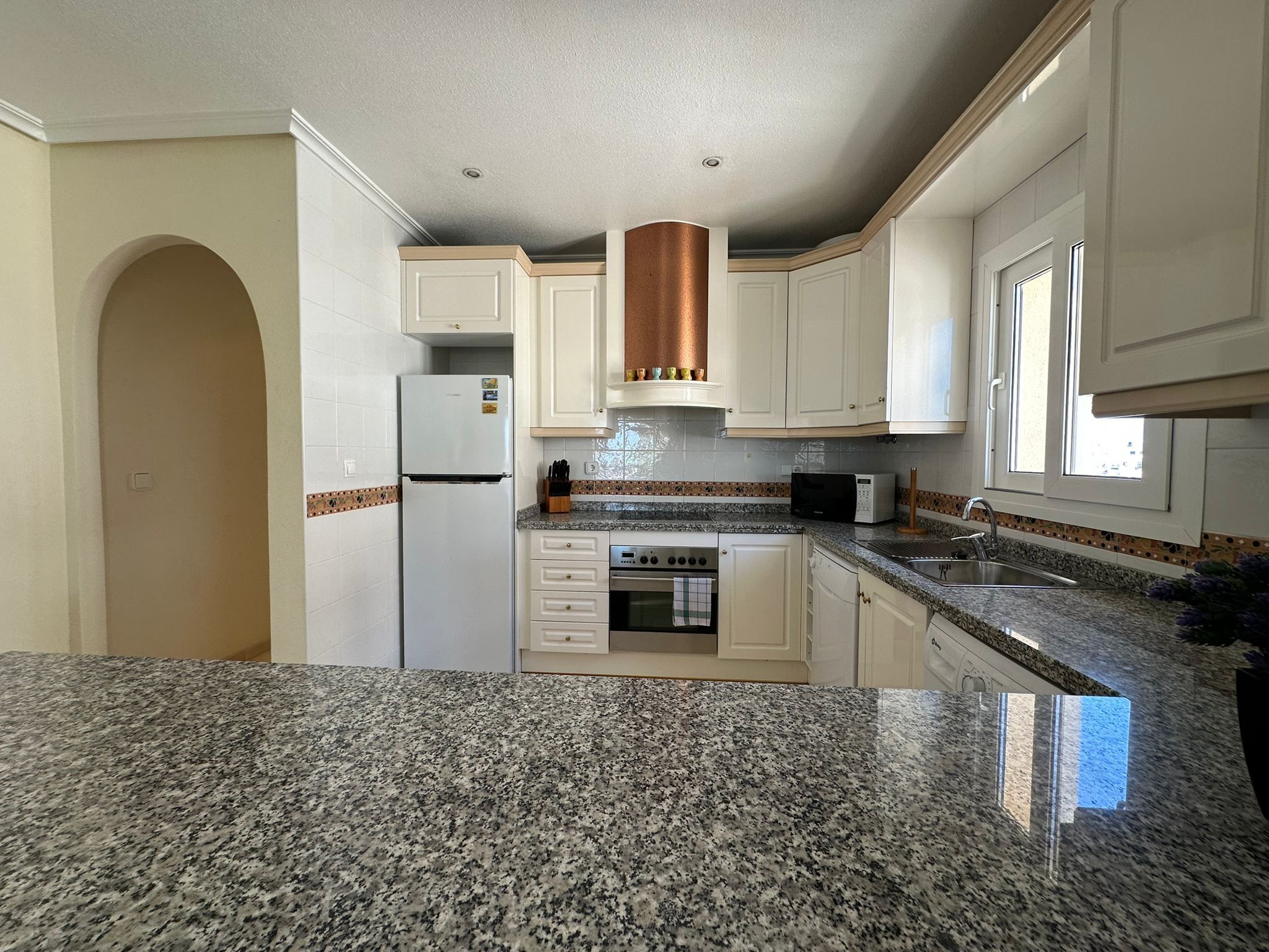 Köket är praktiskt och fullt utrustat för vardagens behov, och lägenheten har både luftkonditionering och tvättmaskin, vilket gör livet bekvämt året runt.