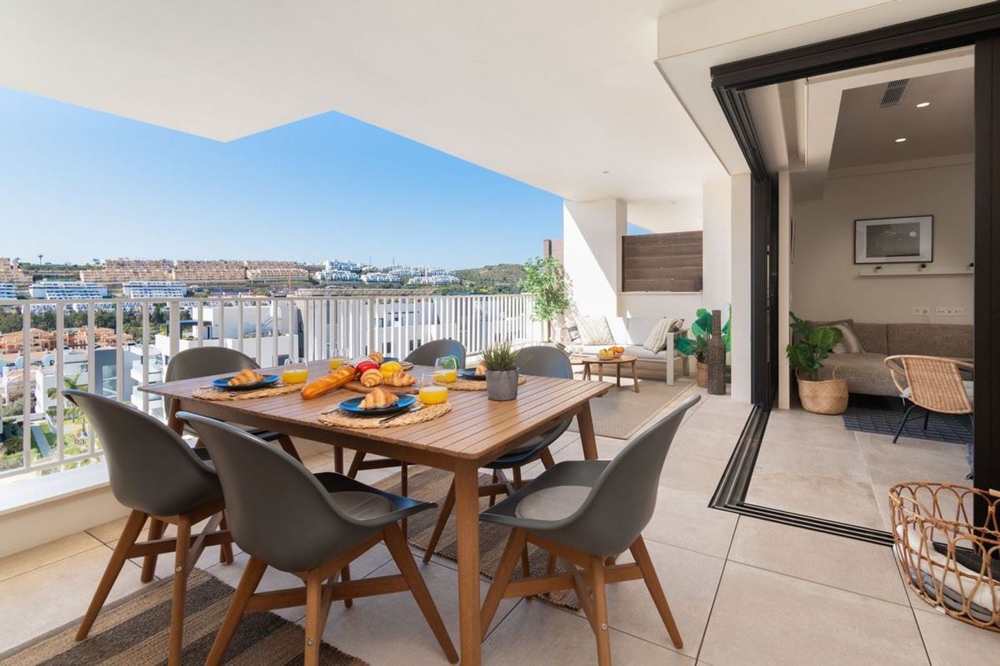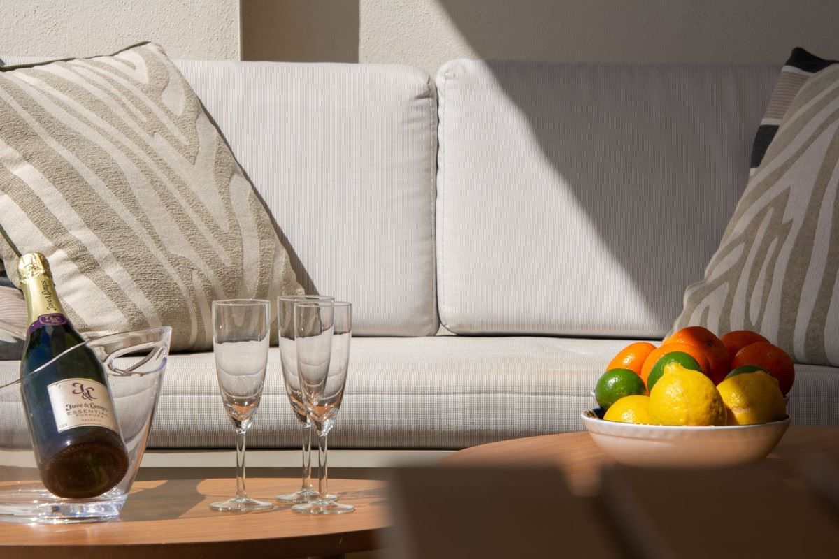 Exklusiv och modern lägenhet i Azalea Jardinana i La Cala med panoramautsikt över havet och hela La Cala. Här bor du i ett lugnt och privat område med endast 100 meter till matbutiker och restauranger samt gångavstånd till strand och centrum – en perfekt balans mellan avkoppling och livfull atmosfär. Bostaden erbjuder hög standard med noggrant utvalda material, stilren inredning och förstklassiga vitvaror. Lägenheten har två rymliga sovrum, två eleganta badrum varav ett ensuite, samt generösa sällskapsytor med stora glaspartier som öppnar upp mot terrasser i både öst och väst. Den västvända terrassen är en privat oas med lounge, matplats och plats för sol och grill, samtidigt som du njuter av fantastisk utsikt över hav, poolområde och byn. Det nybyggda området omges av vackra trädgårdar och erbjuder exklusiva gemensamma faciliteter såsom två pooler, varav en uppvärmd, gym, spelrum samt hög säkerhet med inhägnat område, kameraövervakning och garage. Lägenheten säljs fullt möblerad och inflyttningsklar. Med närhet till golfbanor, goda kommunikationer och över 300 soldagar per år är detta ett boende som passar lika bra som permanent hem som exklusivt semesterboende – en unik möjlighet där design, komfort och läge möts.