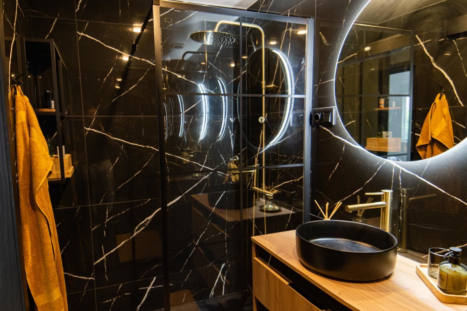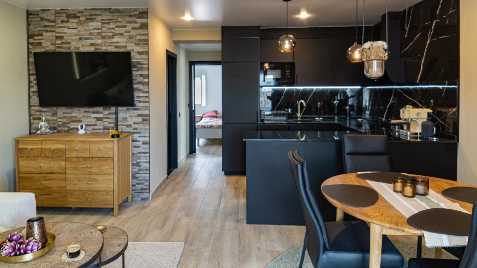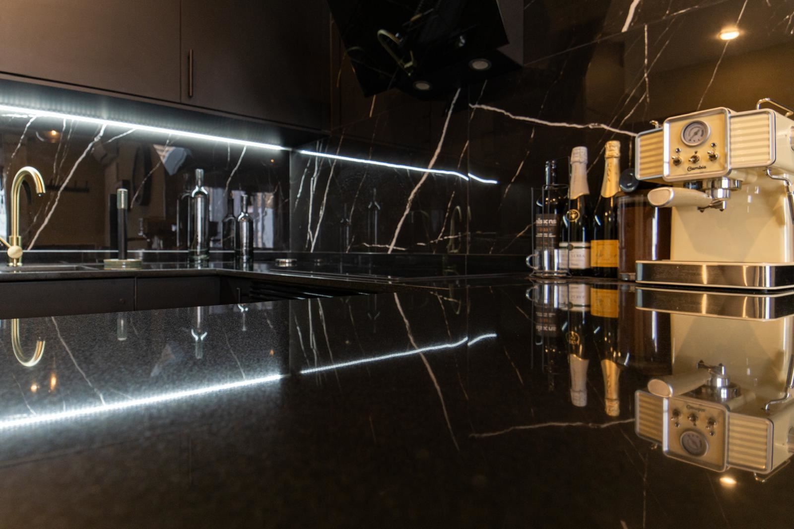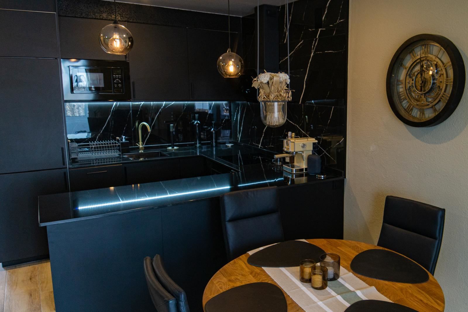 Det stilrena köket är en riktig höjdpunkt. Med sin eleganta design i svart marmor skapar det en exklusiv och modern känsla som passar perfekt för både vardag och sociala stunder. Alla vitvaror och detaljer är genomtänkta för att göra köket både vackert och funktionellt.
