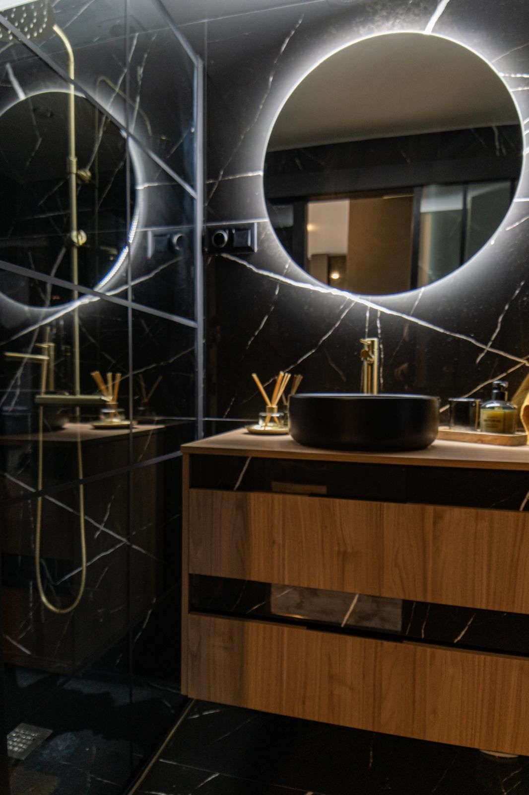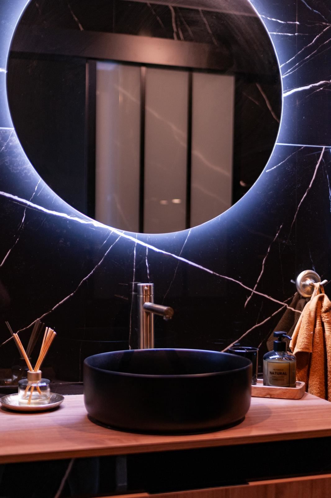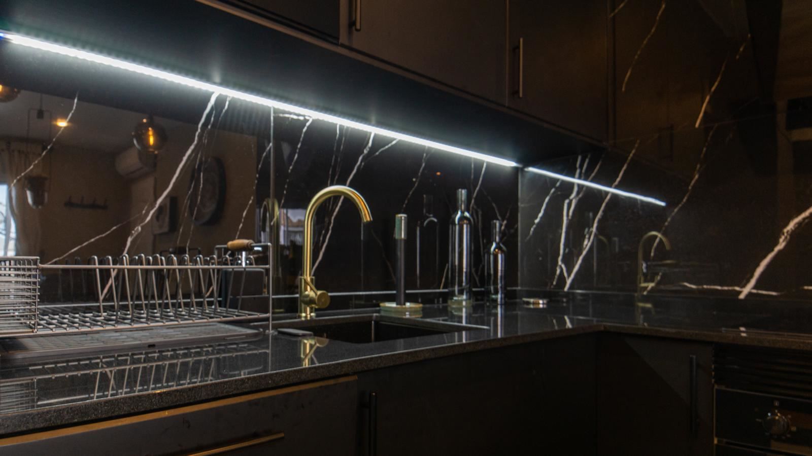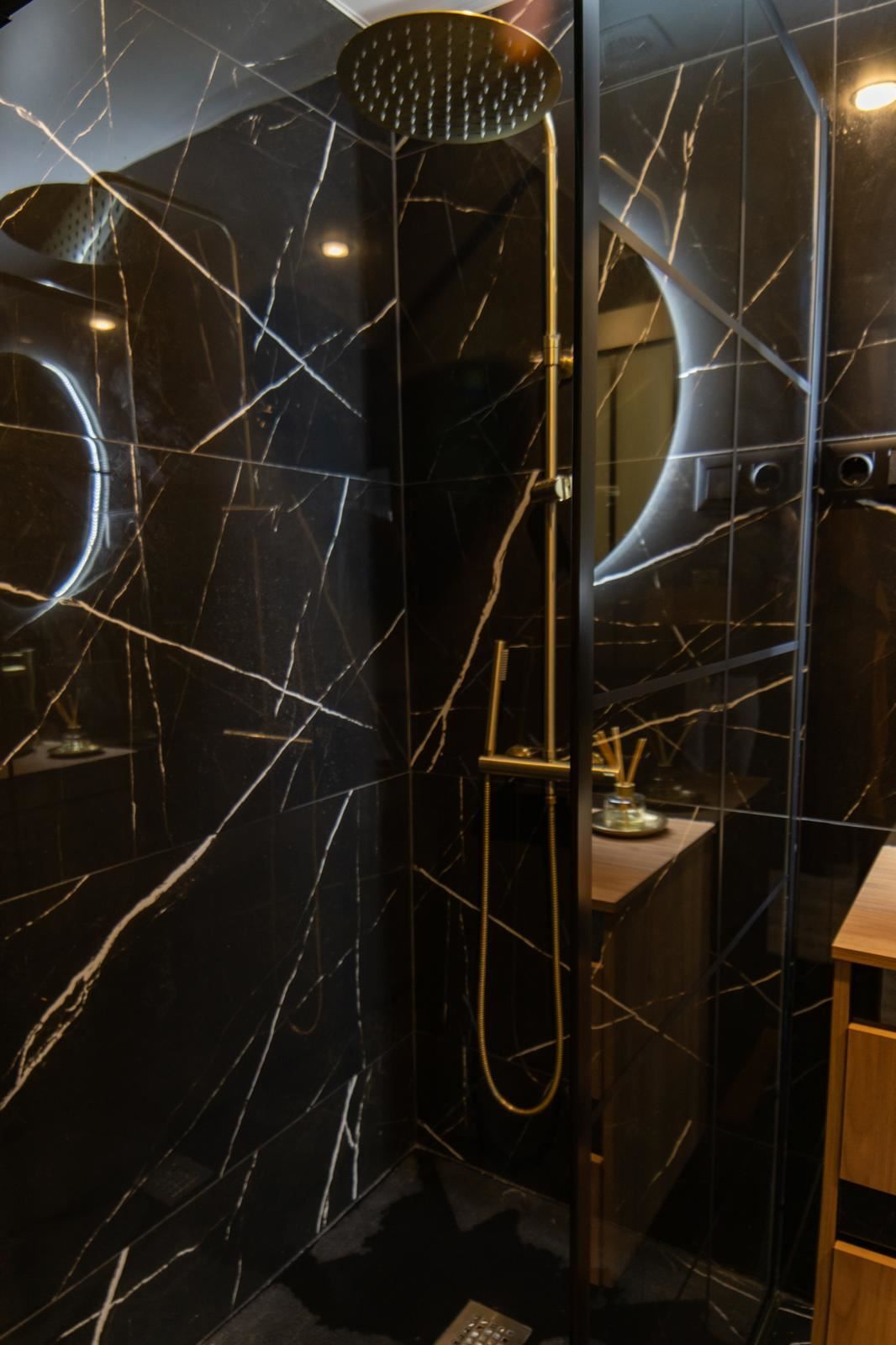 Det stilrena köket är en riktig höjdpunkt. Med sin eleganta design i svart marmor skapar det en exklusiv och modern känsla som passar perfekt för både vardag och sociala stunder. Alla vitvaror och detaljer är genomtänkta för att göra köket både vackert och funktionellt.