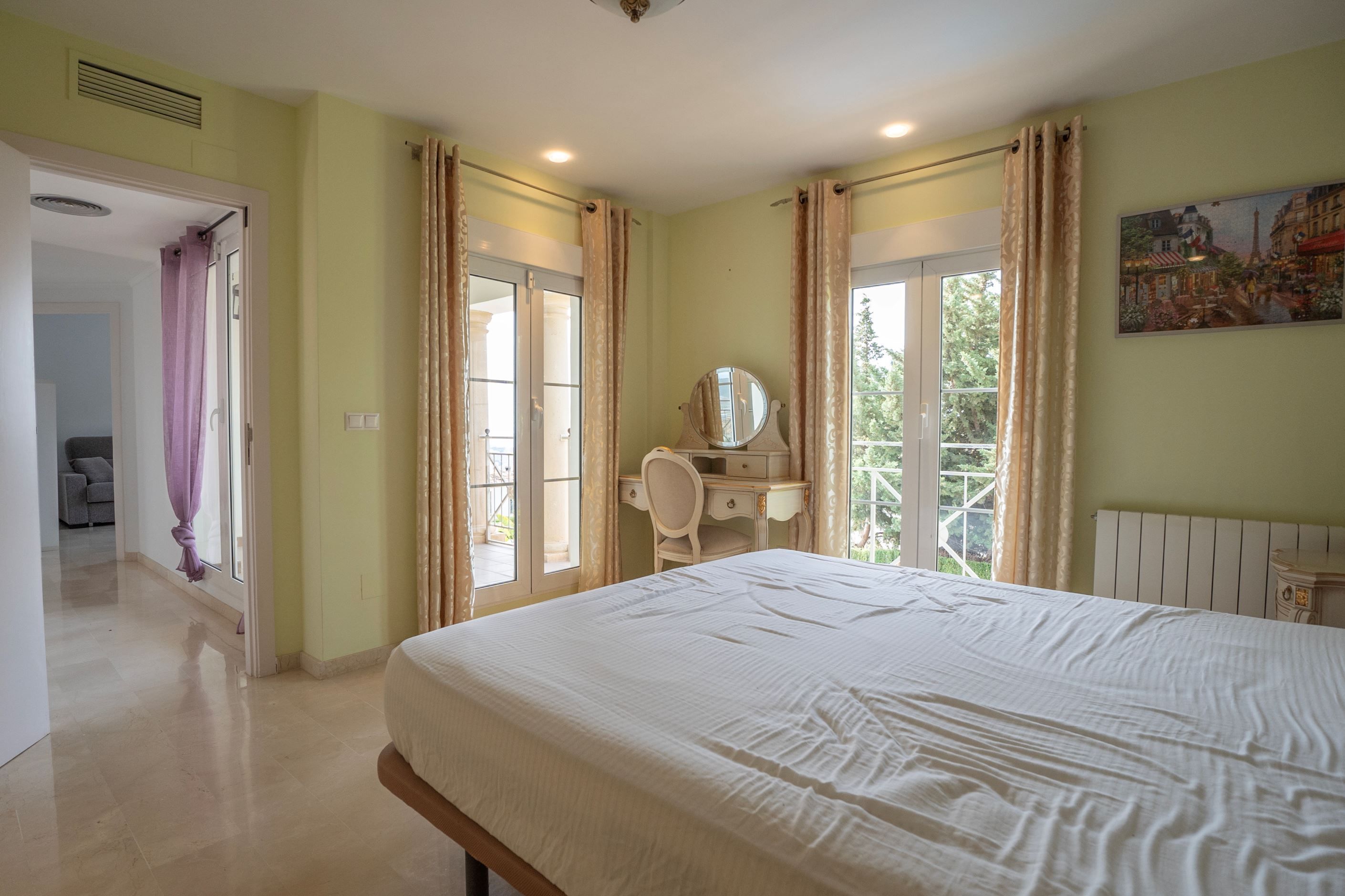 På övervåningen finns tre sovrum, inklusive huvudsovrummet med eget badrum och tillgång till en stor terrass med imponerande utsikt.