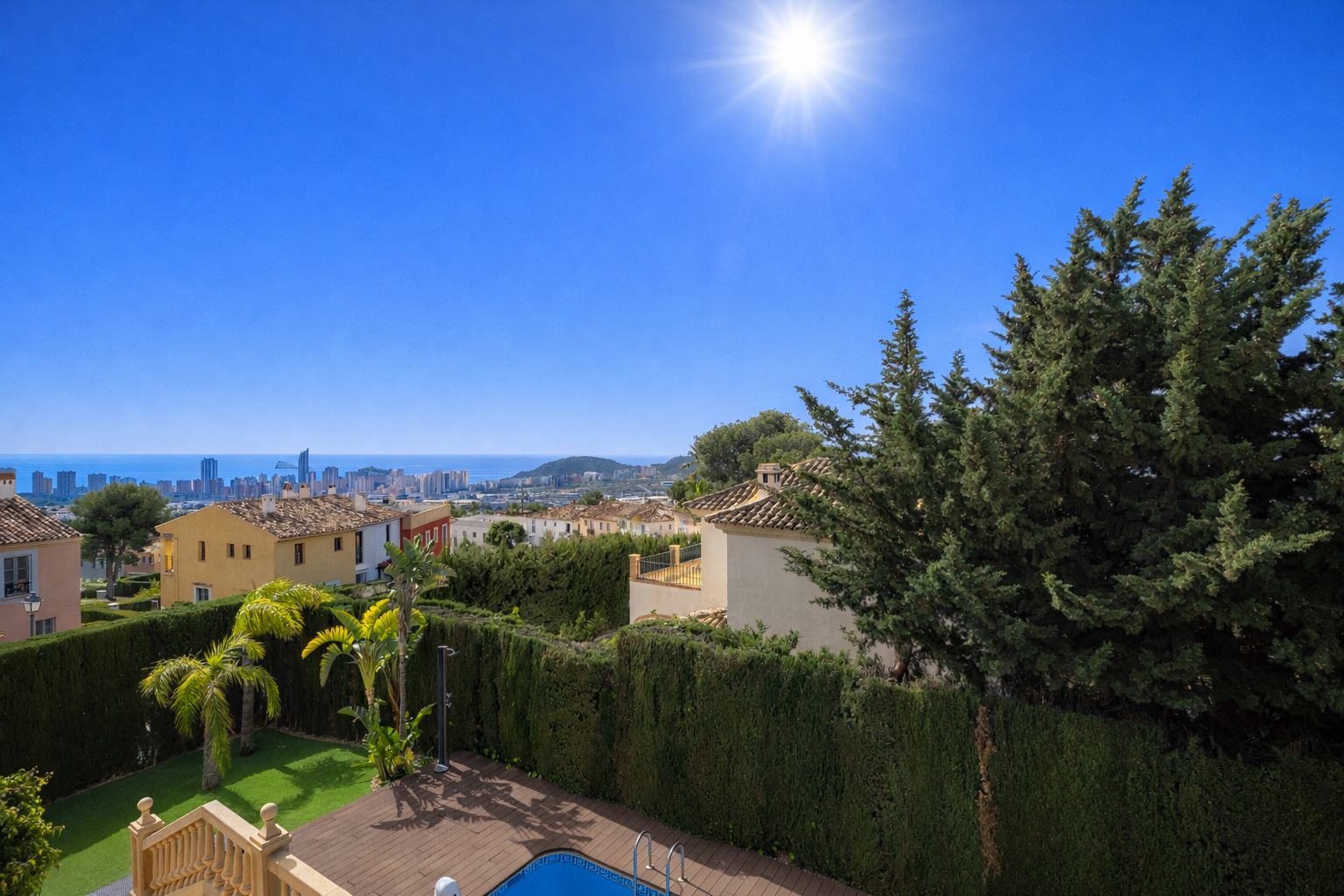 Belägen i ett av de mest exklusiva områdena på Costa Blanca erbjuder denna friliggande villa en lugn miljö med fantastisk utsikt över havet, bergen och Benidorm, med närhet till alla bekvämligheter.