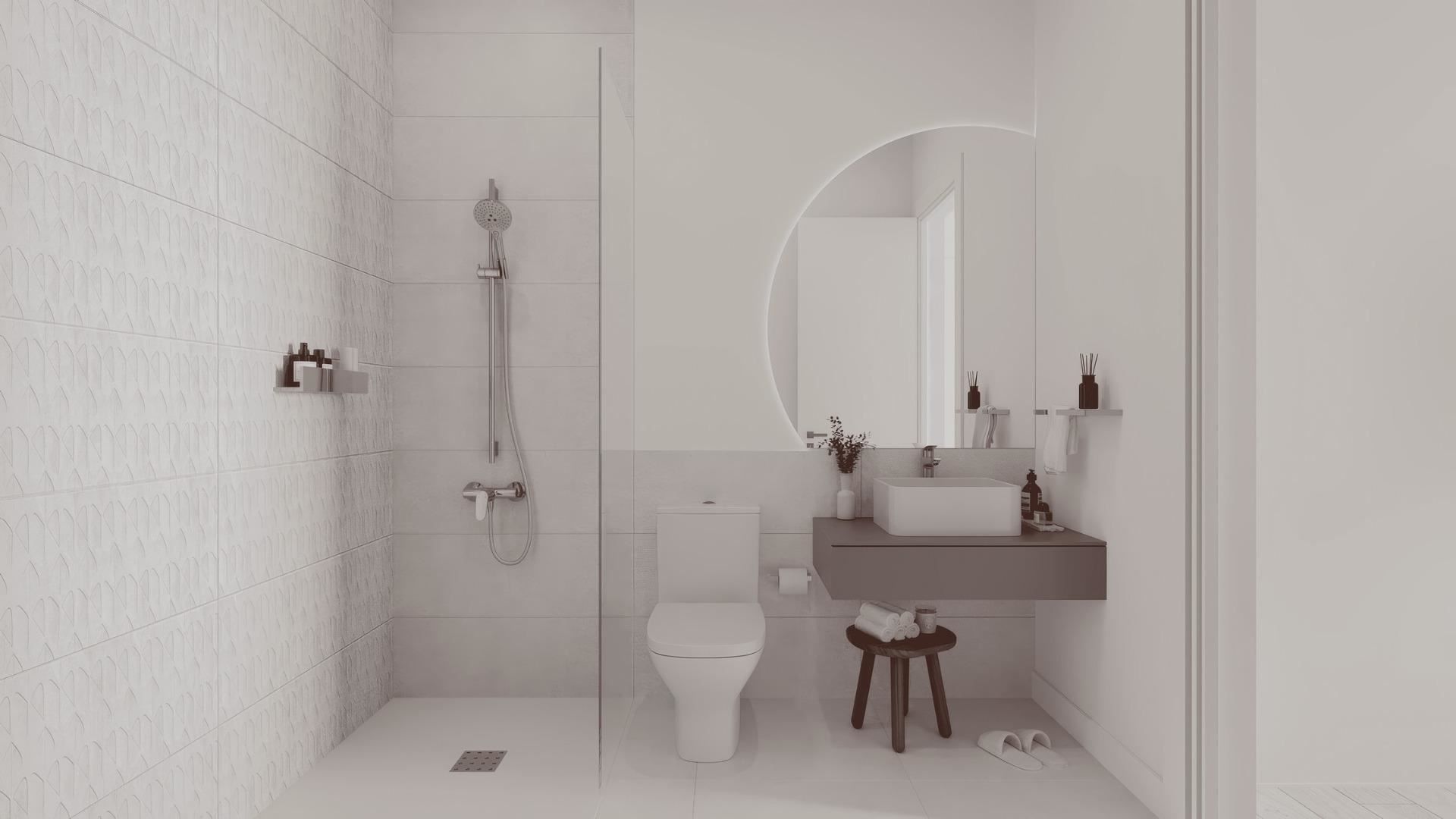 Eleganta badrum med högkvalitativa armaturer och duschkabiner i resin