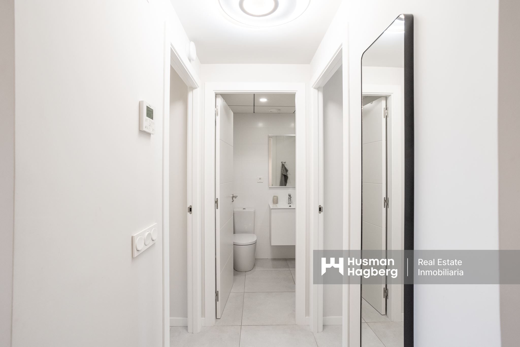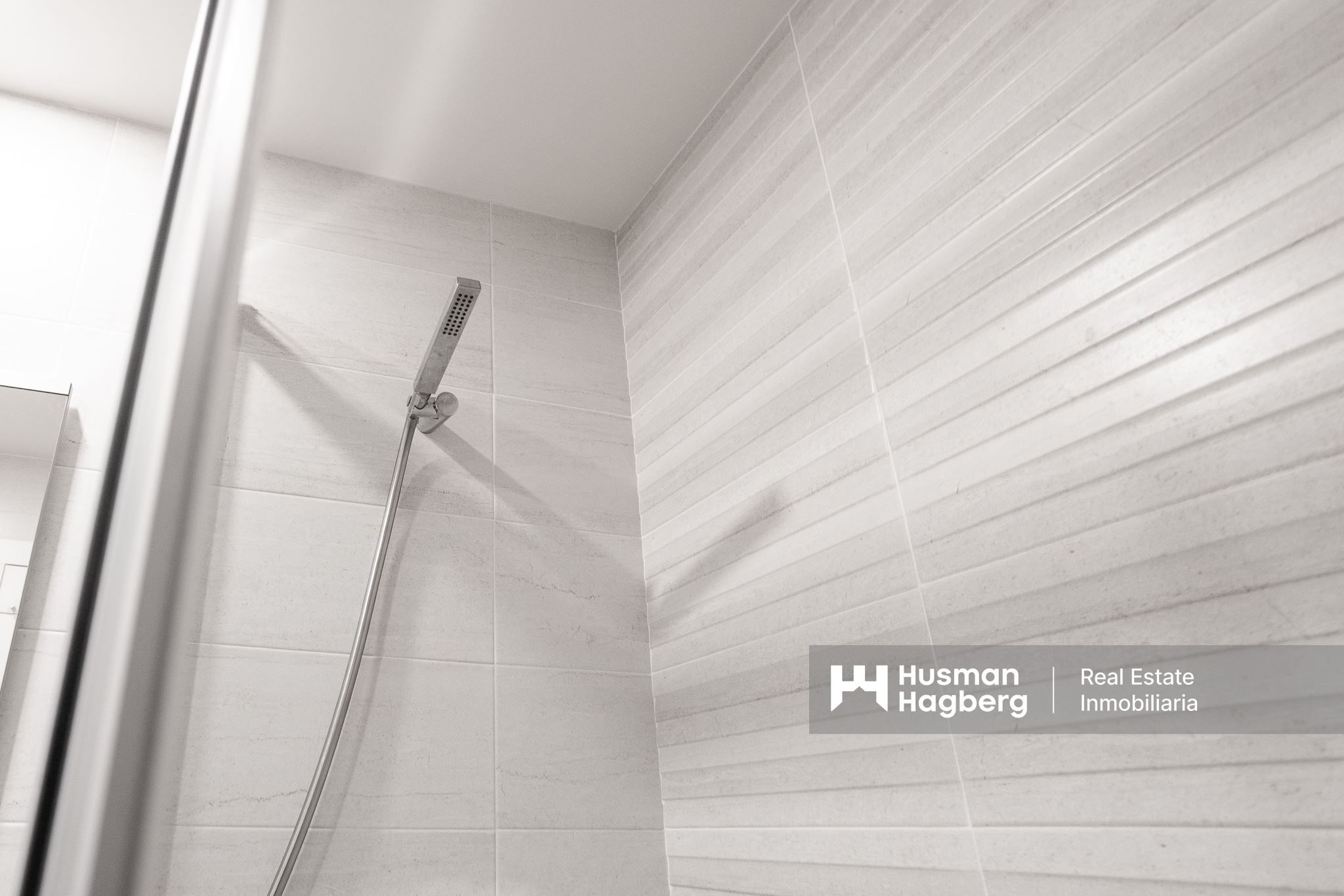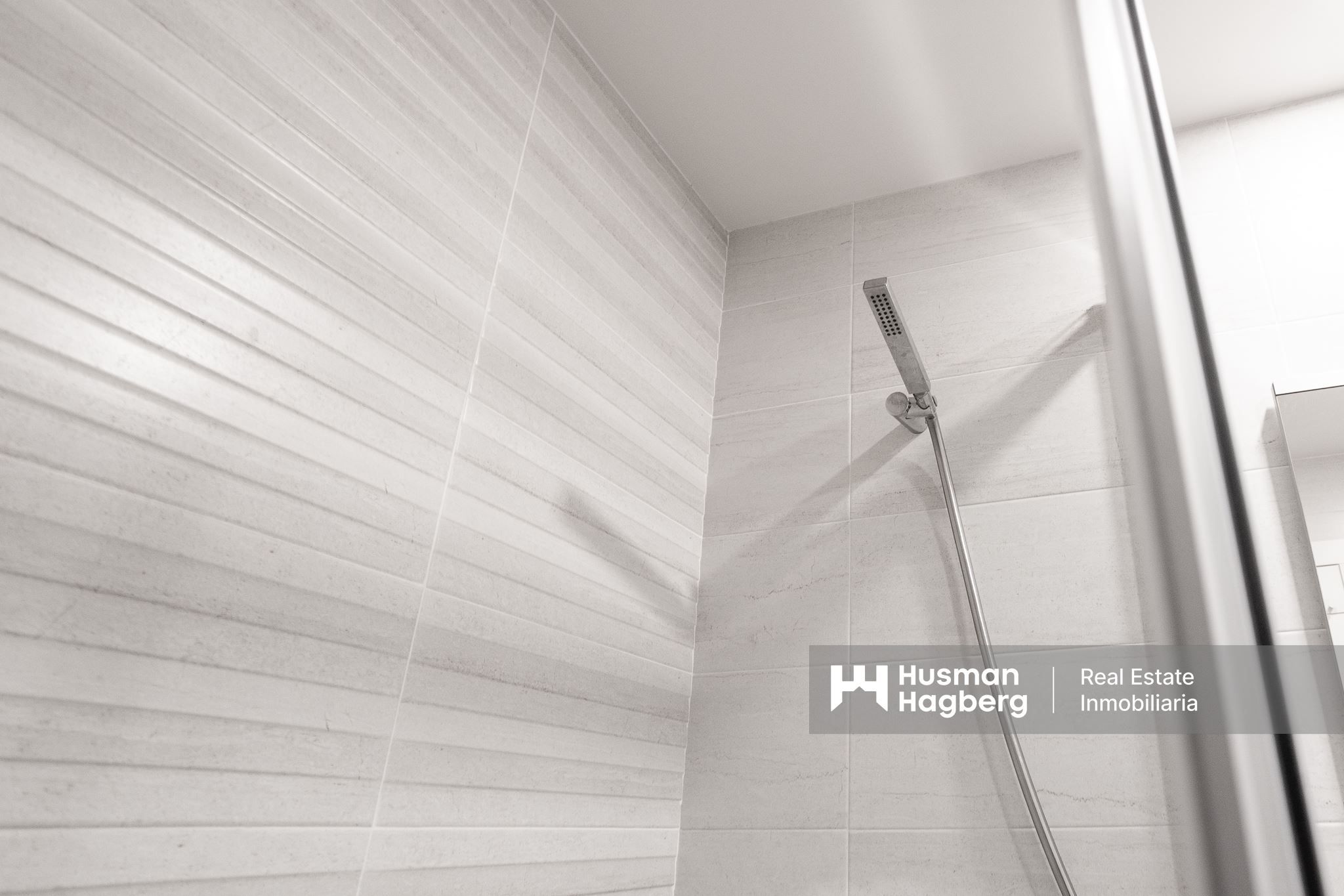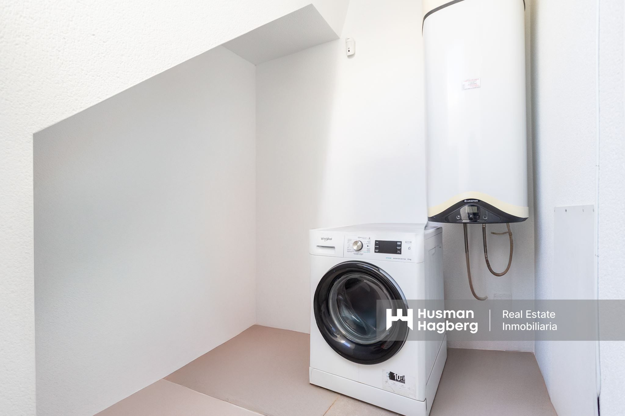 På den privata uteplatsen finner du även en smart placerad tvättmaskin, diskret integrerad för att frigöra yta inomhus och göra vardagen lite enklare. De två sovrummen är rogivande och genomtänkta i sin planering, med fina förvaringsmöjligheter och en lugn atmosfär. De två badrummen gör bostaden särskilt bekväm för både familjer, par och gäster.
