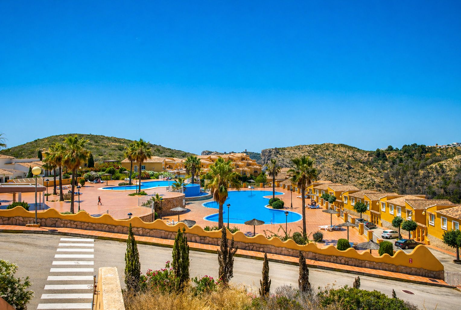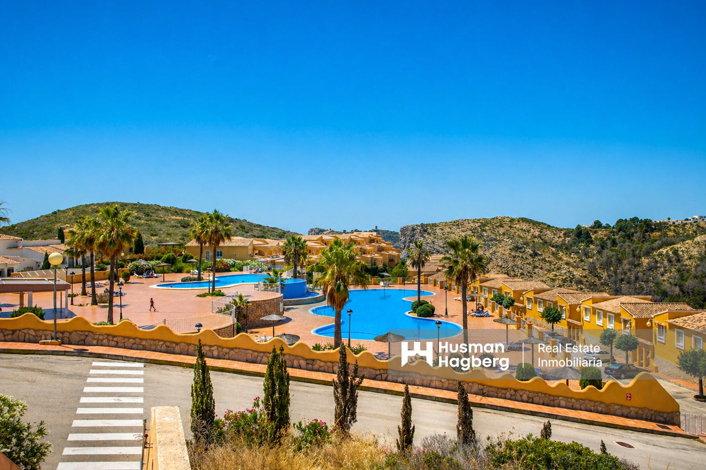 Området erbjuder fina gemensamma faciliteter såsom poolområden, trädgårdar och ytor för avkoppling. Läget ger både privatliv och närhet till hav och service.