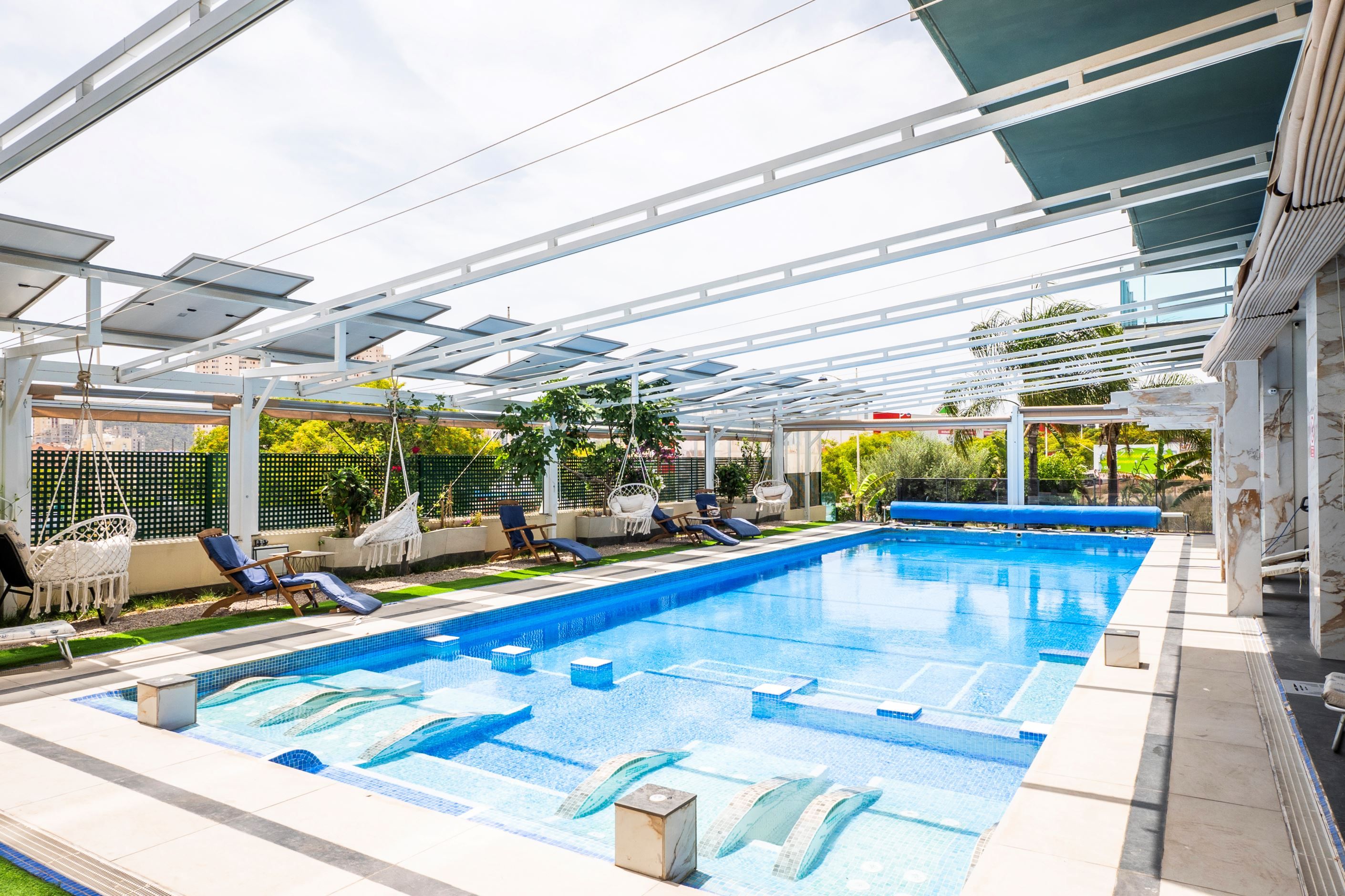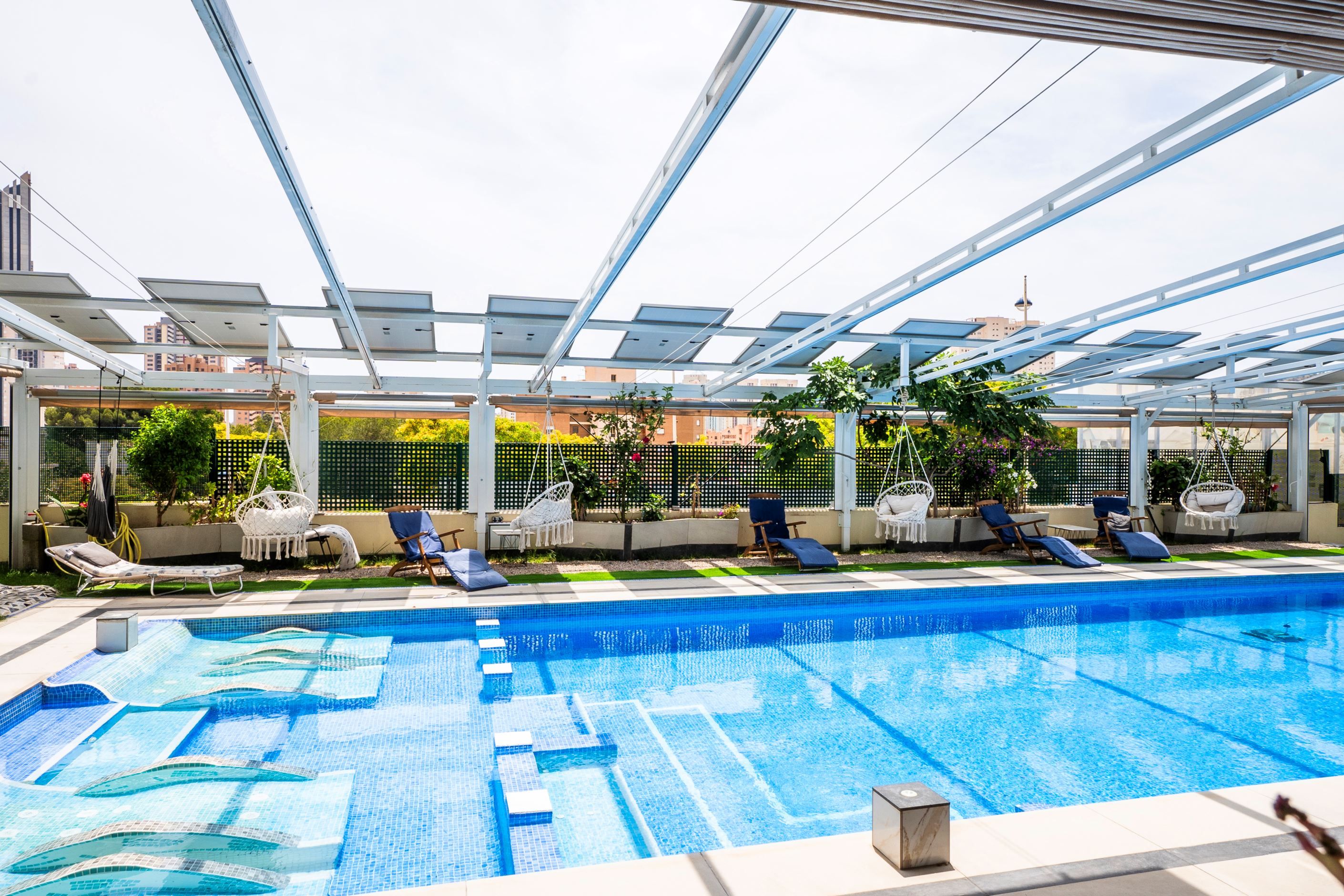 I de gemensamma utrymmena finns en pool med hydromassage, stora grönområden och rekreationsområden. Här finns också ett privat utomhusgarage och ett förråd i källaren. Byggnaden har uppförts med material av högsta kvalitet och har ett robotiserat energisparsystem som garanterar effektivitet och hållbarhet.
